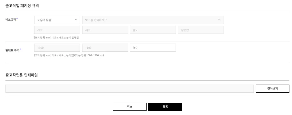 3-3. ‘출고작업 패키징 규격’ 입력 및 ‘출고작업용 인쇄파일’ 첨부