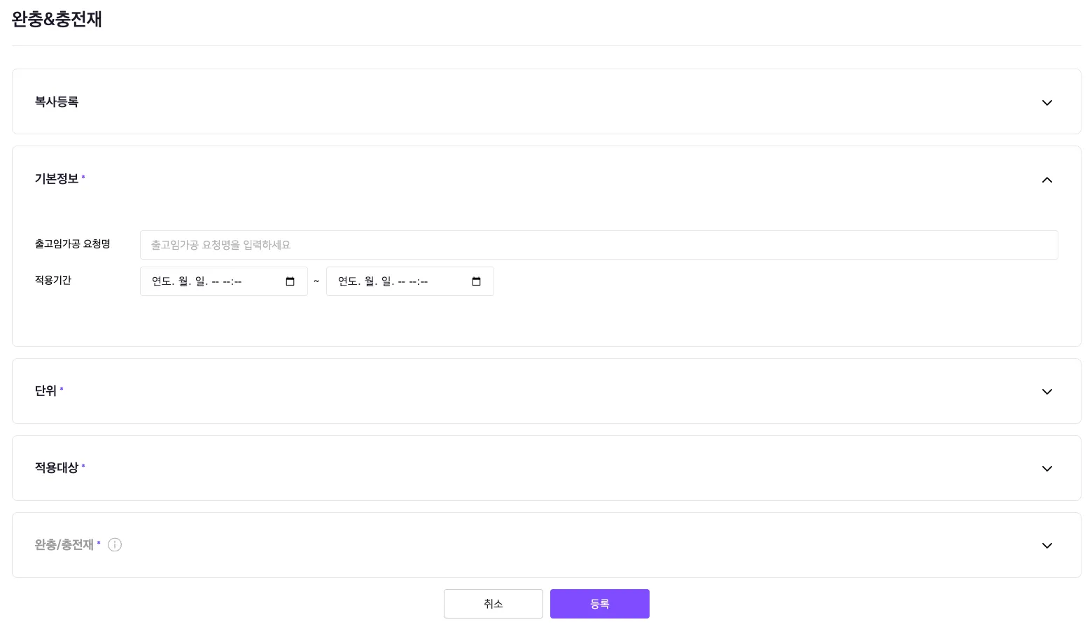 출고 임가공 처리는 적용기간의 시작일시 이후 접수 주문부터, 종료일시 이전 접수 주문까지 반영됩니다.