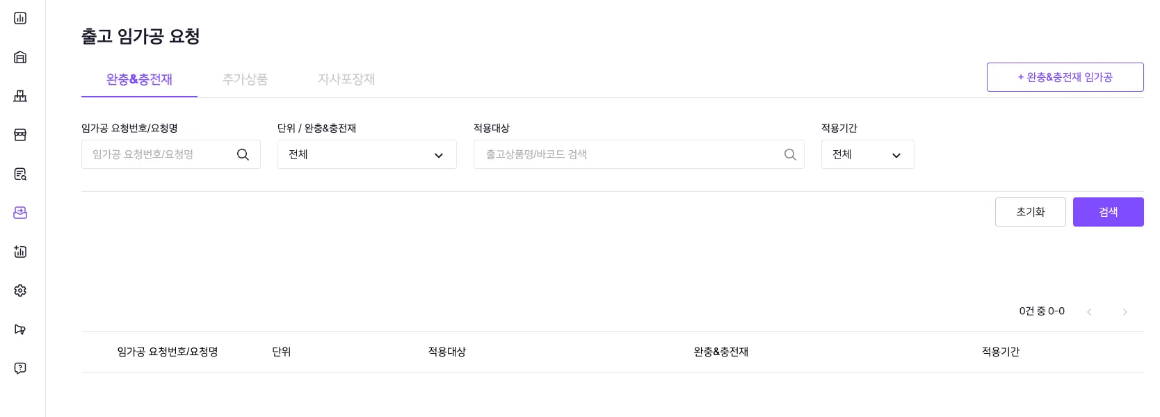 1. ‘임가공 > 출고임가공 요청’ 메뉴 ‘완충&충전재’ 탭 선택후 [+완충&충전재 임가공] 버튼 클릭