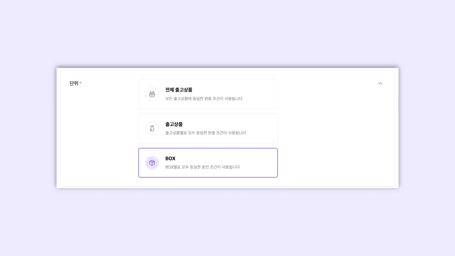 단위를 ‘BOX’로 선택하시면, 포장시 박스의 여유공간을 채우도록 신청 하실 수 있어요. (배송시 흔들림을 방지할 목적으로 활용되요.)