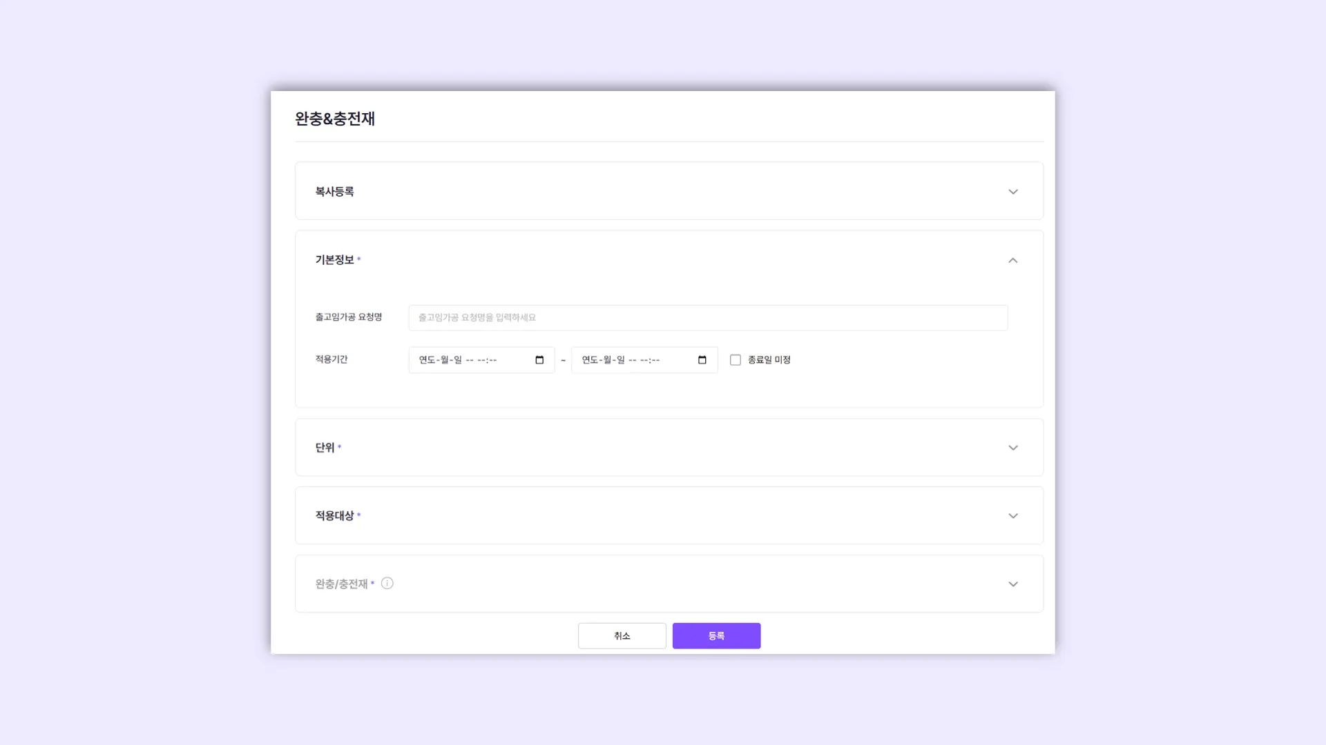 단, 이미 임가공 정책이 적용된 이후라면 시작일시는 변경할 수 없으며, 종료일시는 ‘수정시점 1시간 후 ~ 90일’ 범위에서 선택 가능해요.
