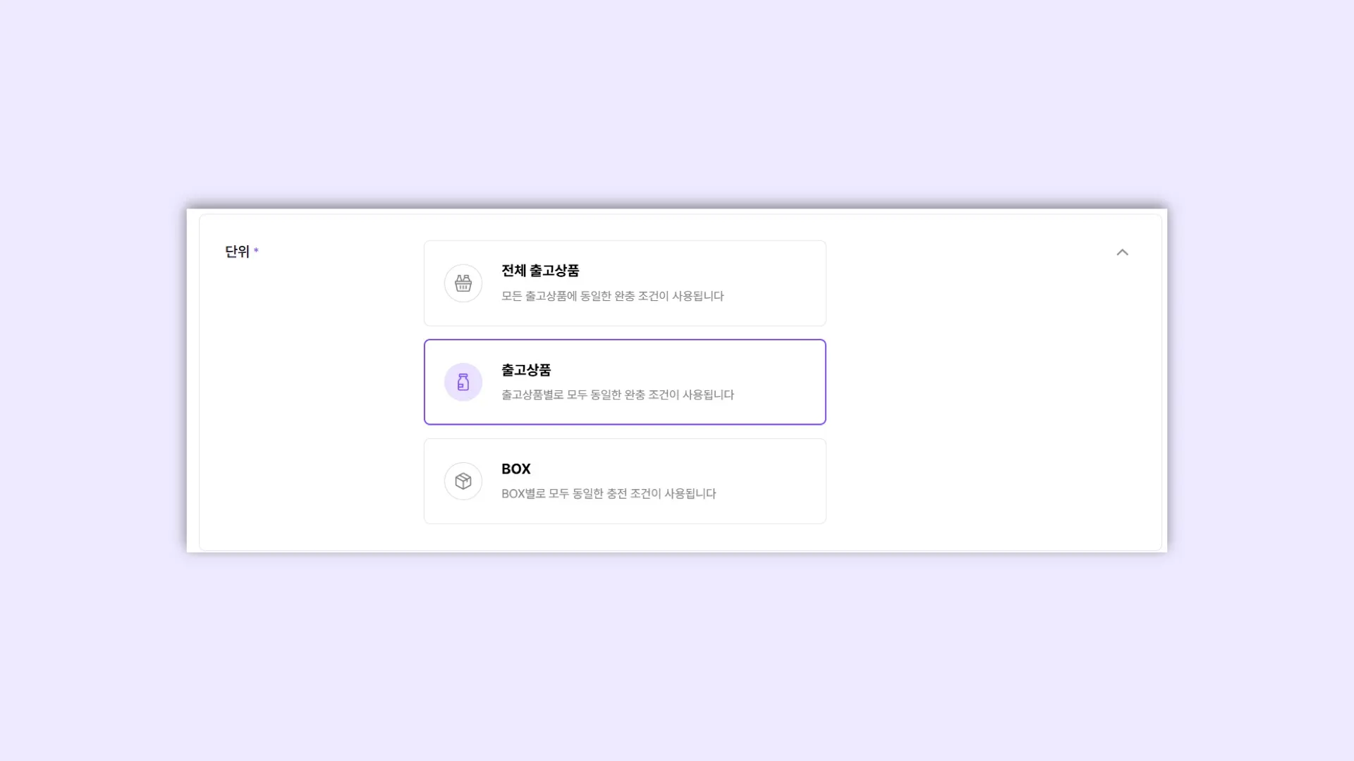 출고임가공 정책의 적용 범위를 ‘출고상품’으로 선택해요.