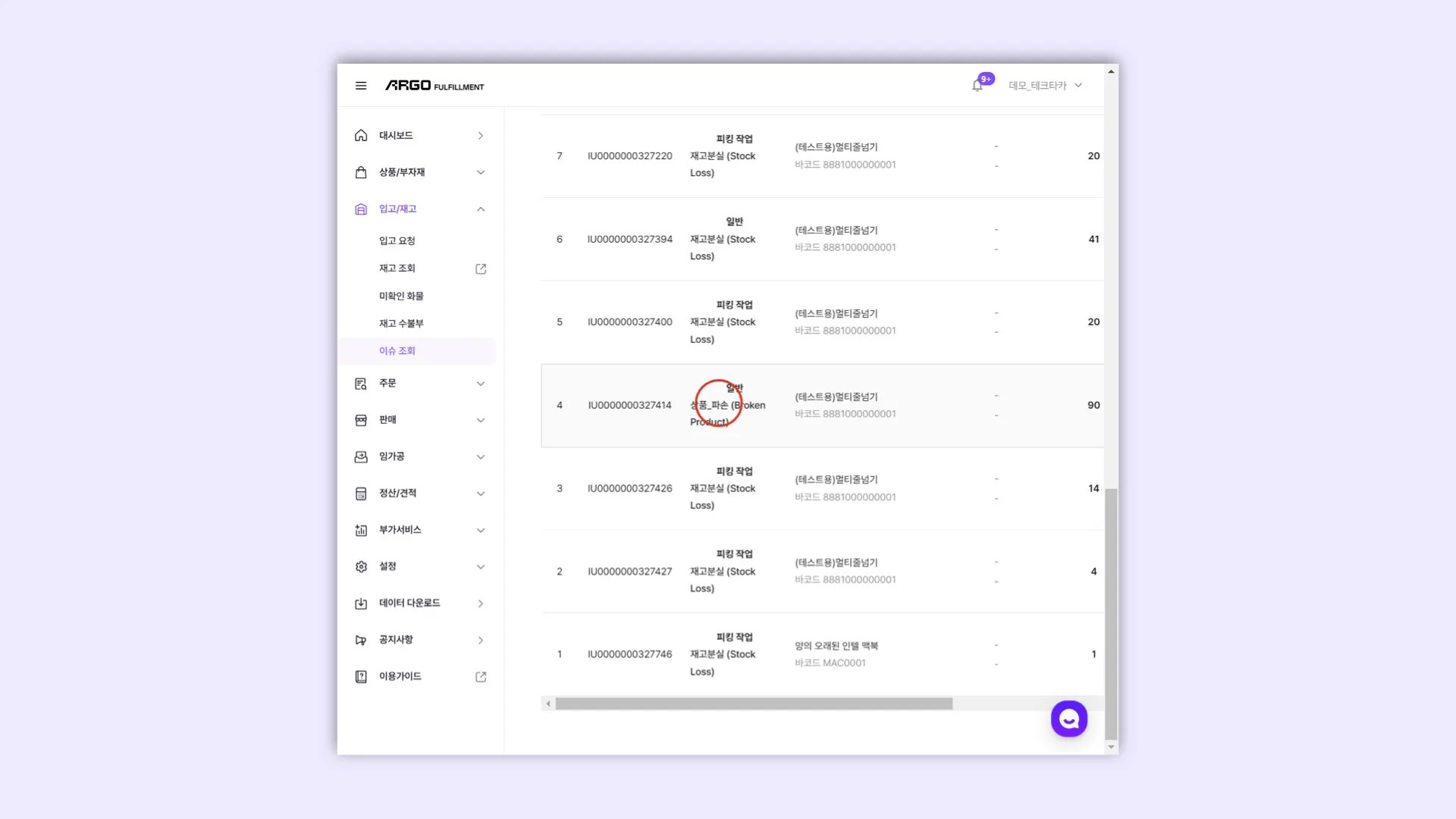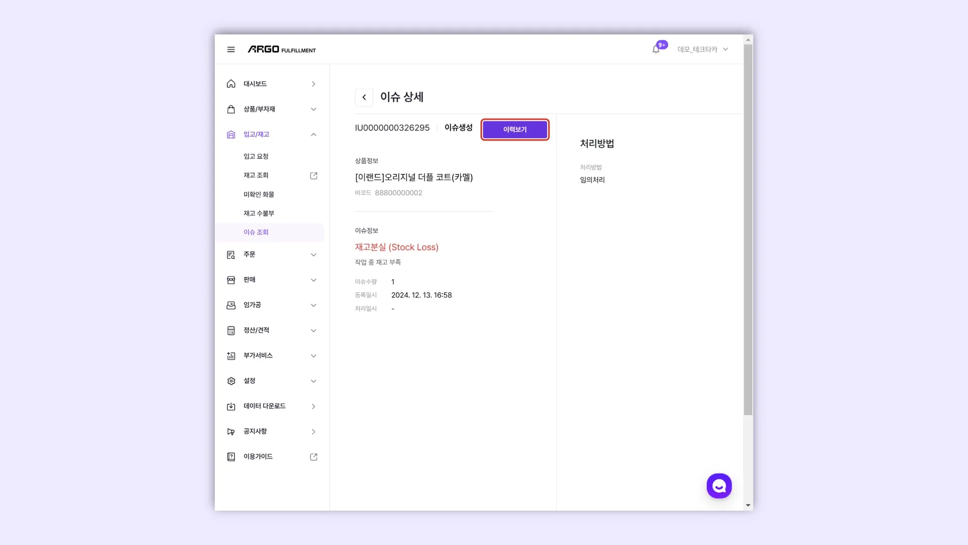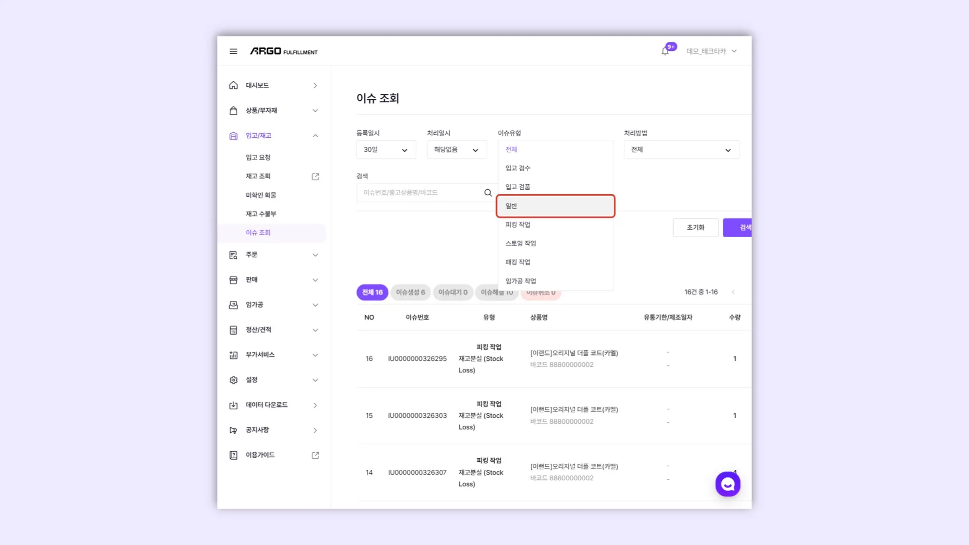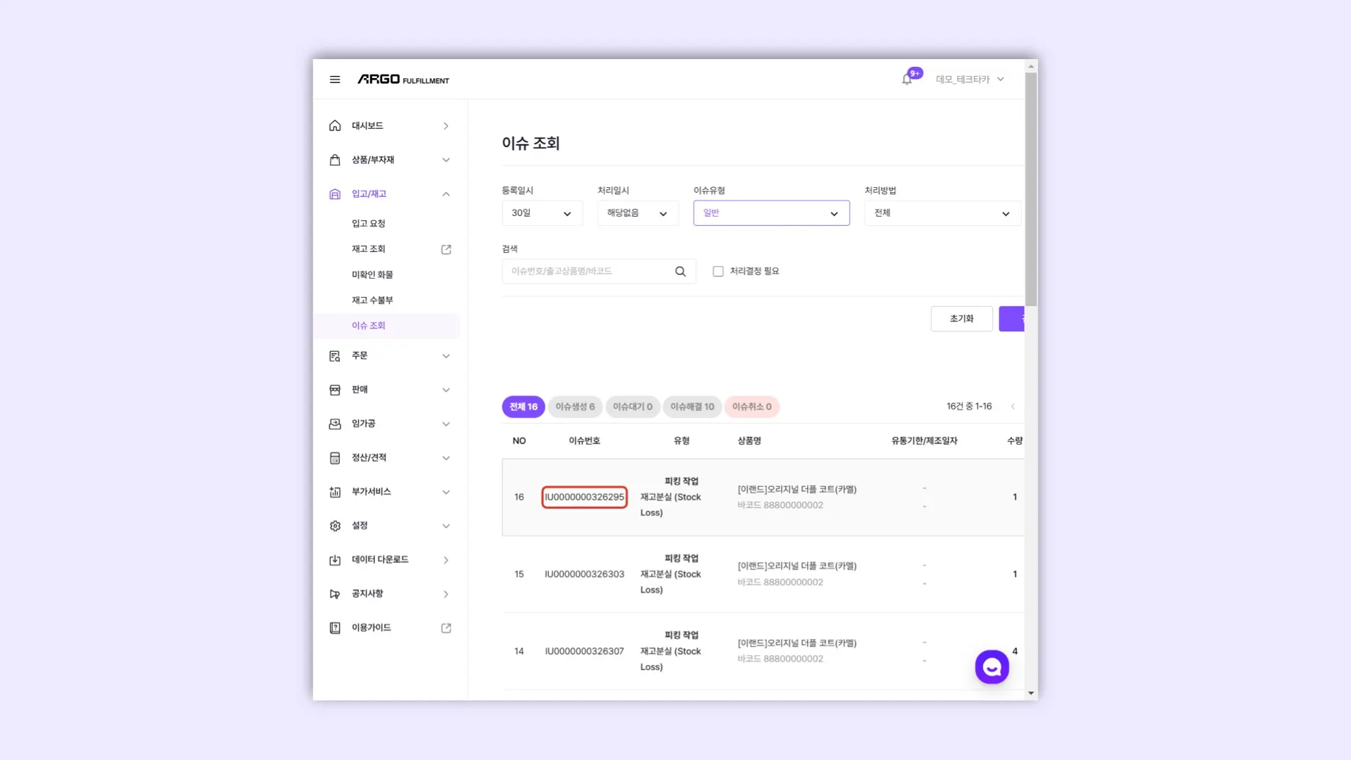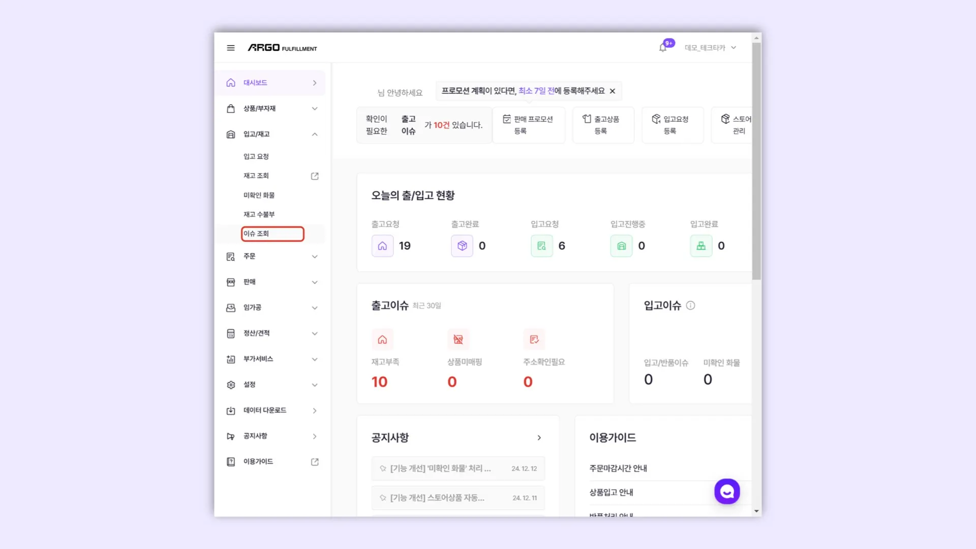 좌측 입고/재고 - 이슈 조회 메뉴를 통해 실시간으로 모니터링하실 수 있어요.