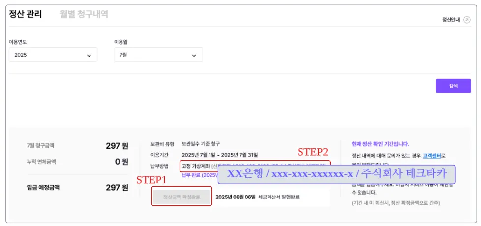 STEP2 : [정산금액 확정완료]버튼을 누르면 표시되는 가상계좌번호로 확정된 금액을 납부해주세요.