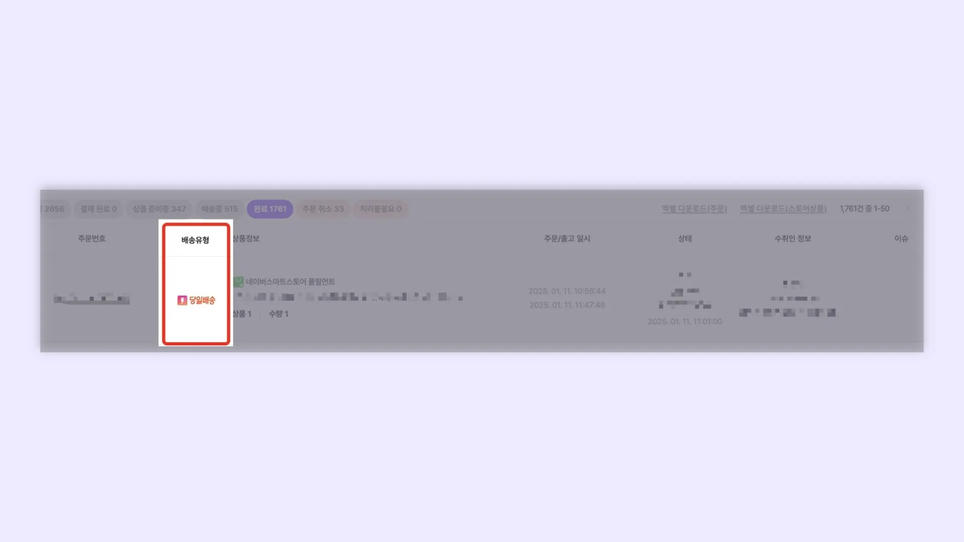 당일배송에 해당하는 주문 건의 경우 아래처럼 [당일배송] 이라는 분홍색 로고가 표시돼요!