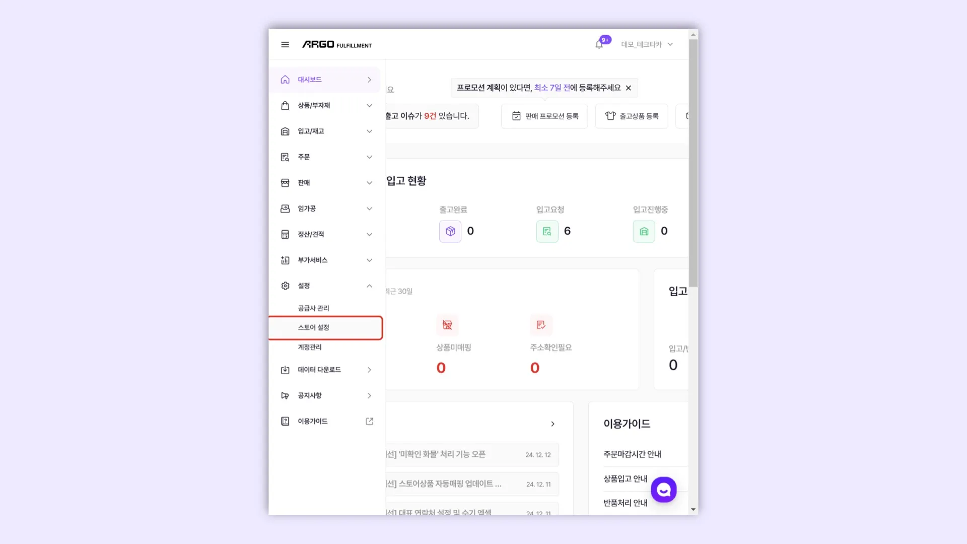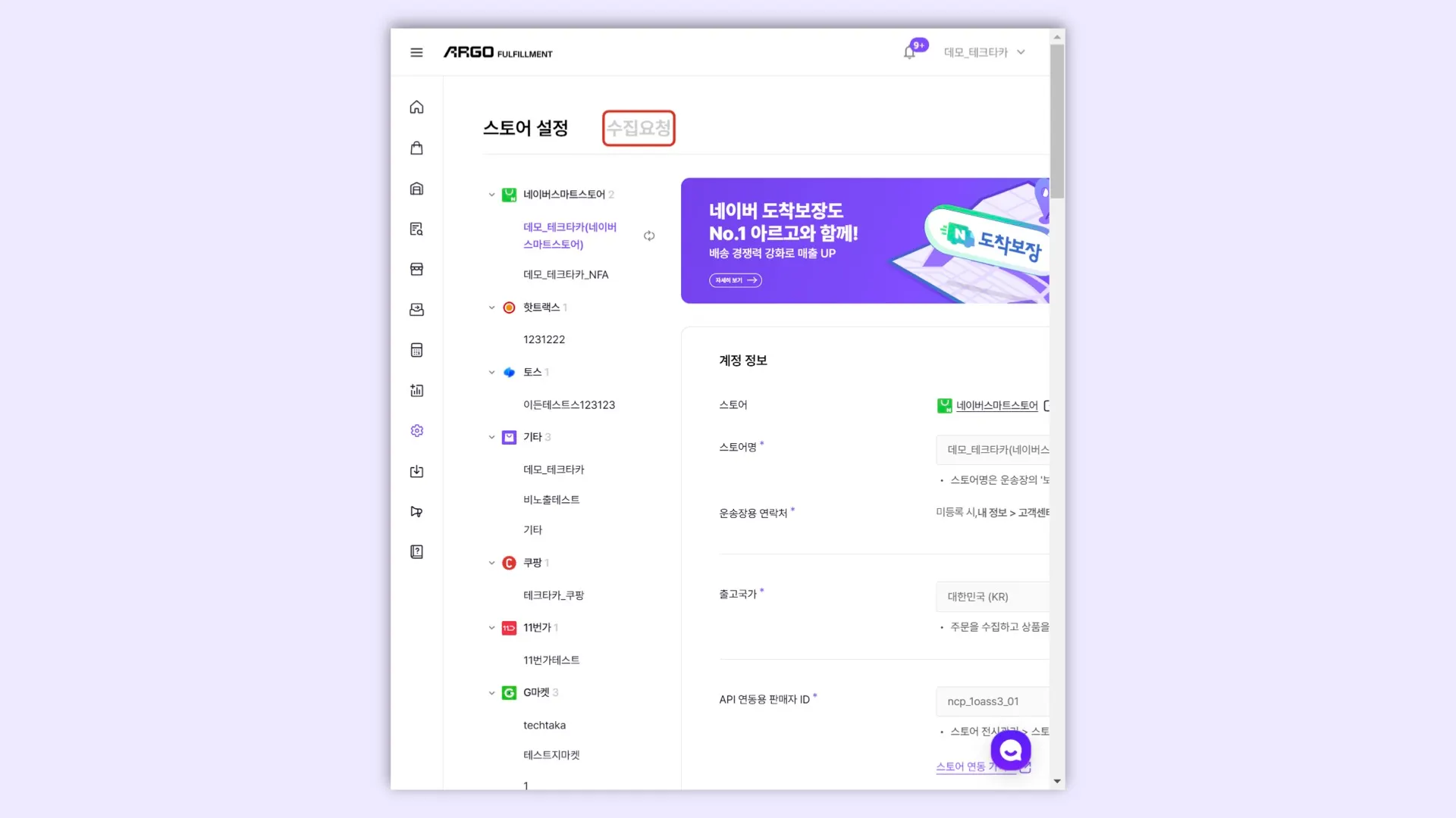 설정 - 스토어 설정 - 수집요청 탭으로 이동