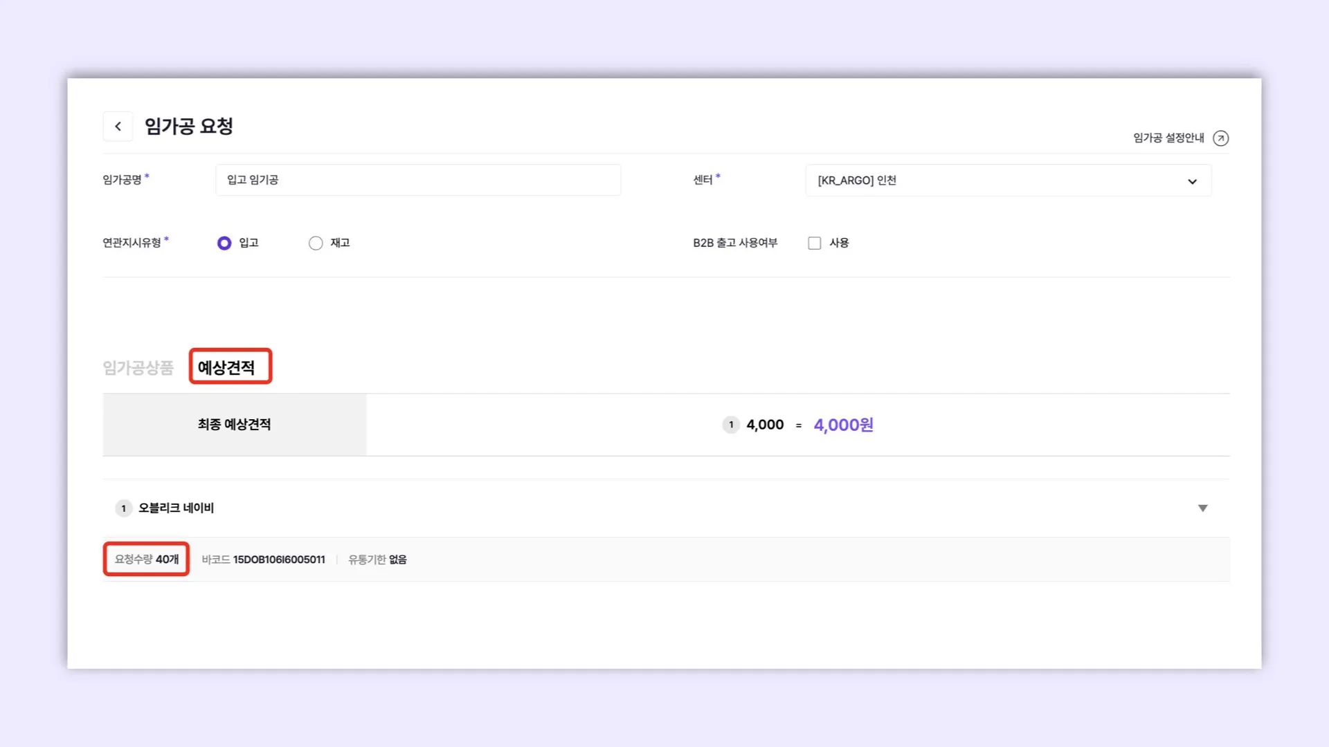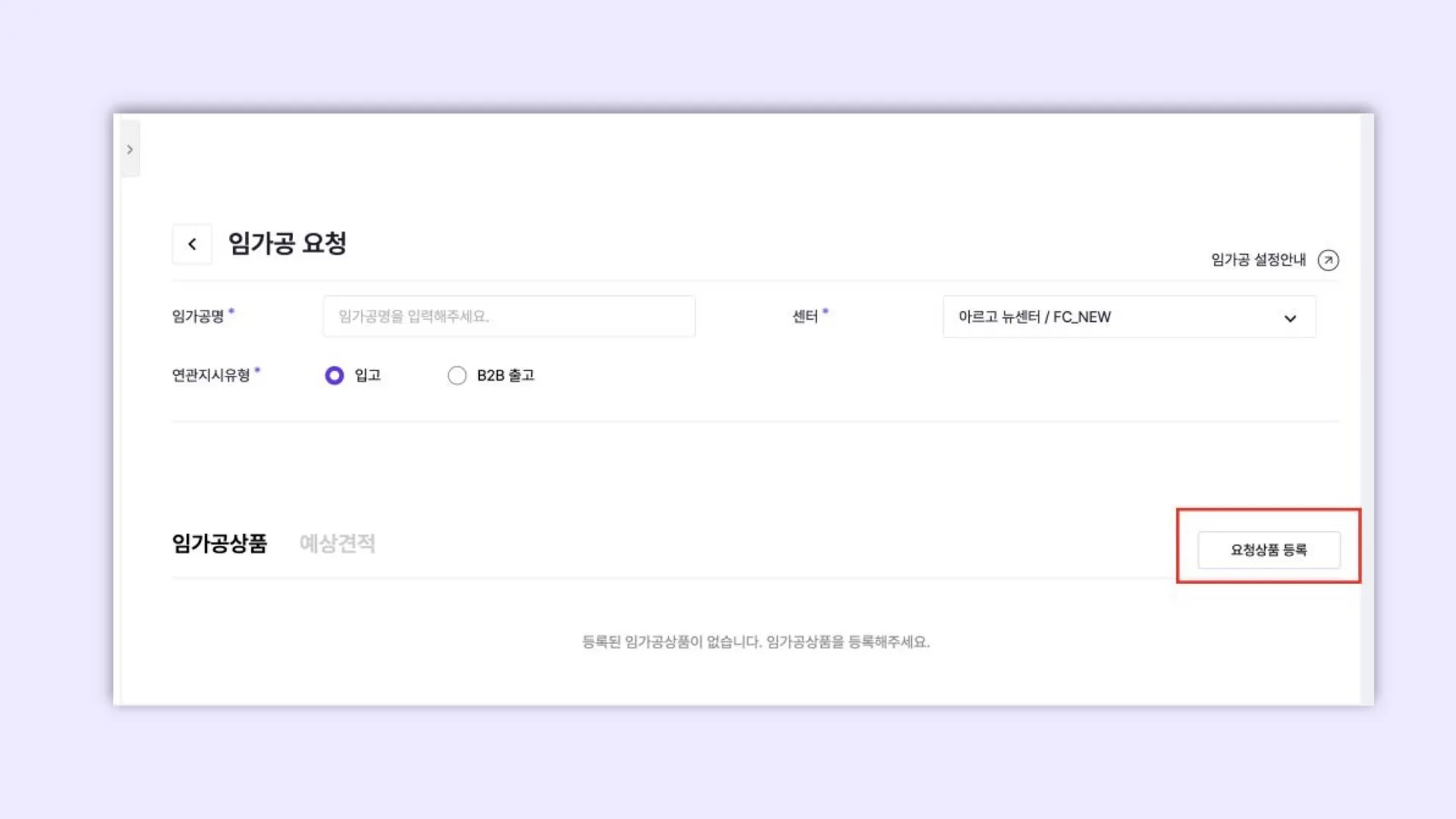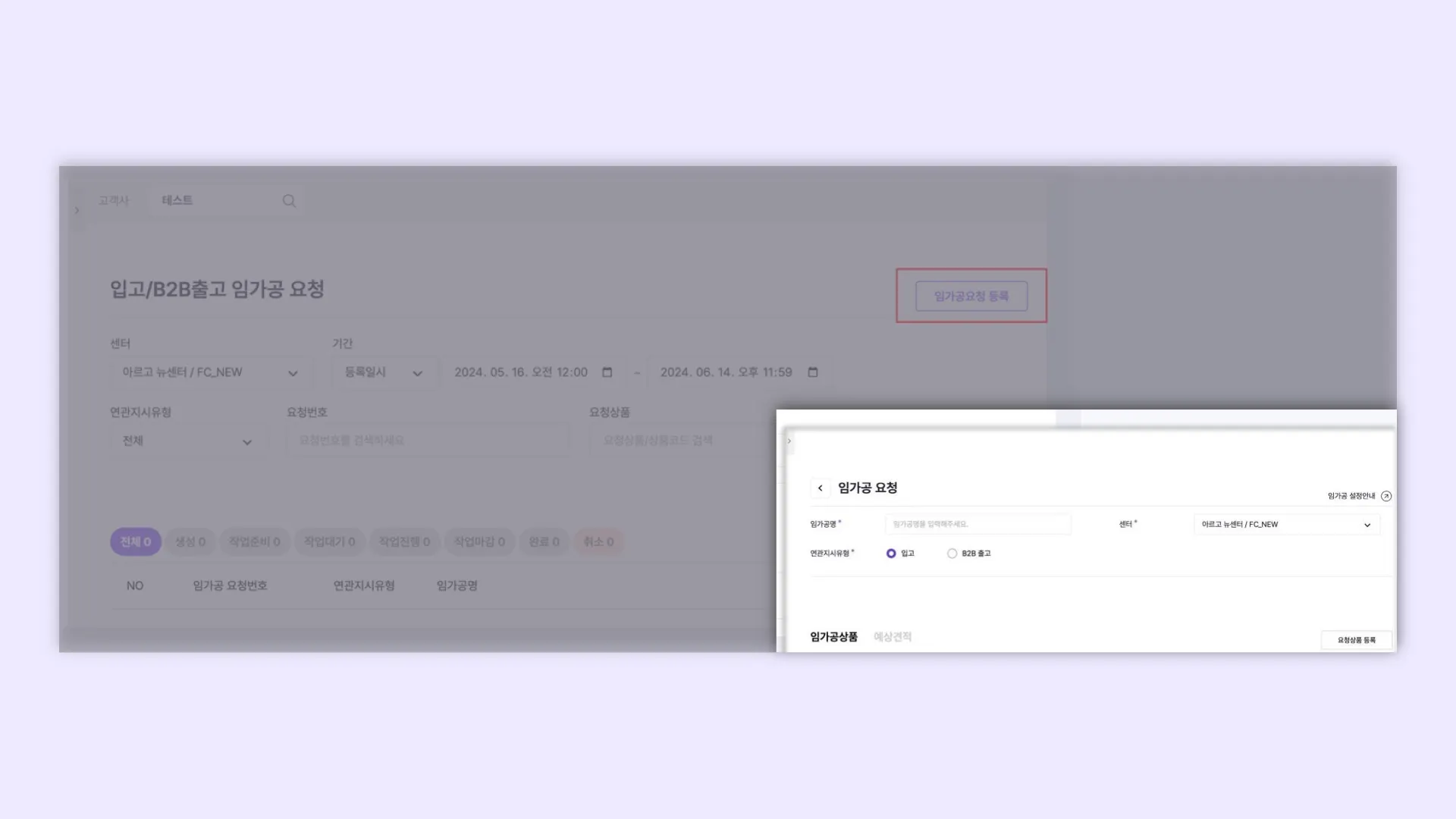 임가공 → 입고/b2b임가공 → 임가공 요청등록