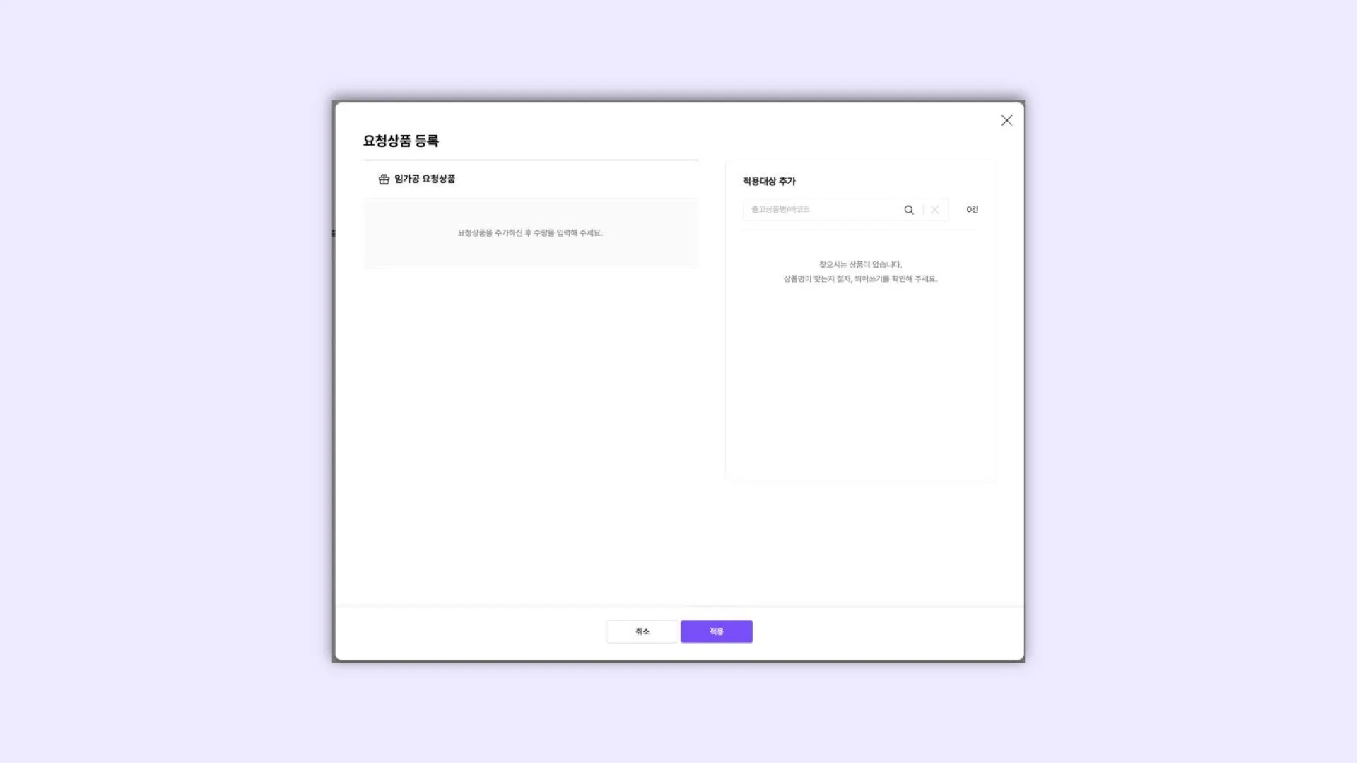 [요청상품 등록] 버튼을 클릭하면 요청상품 등록 모달이 띄워집니다.