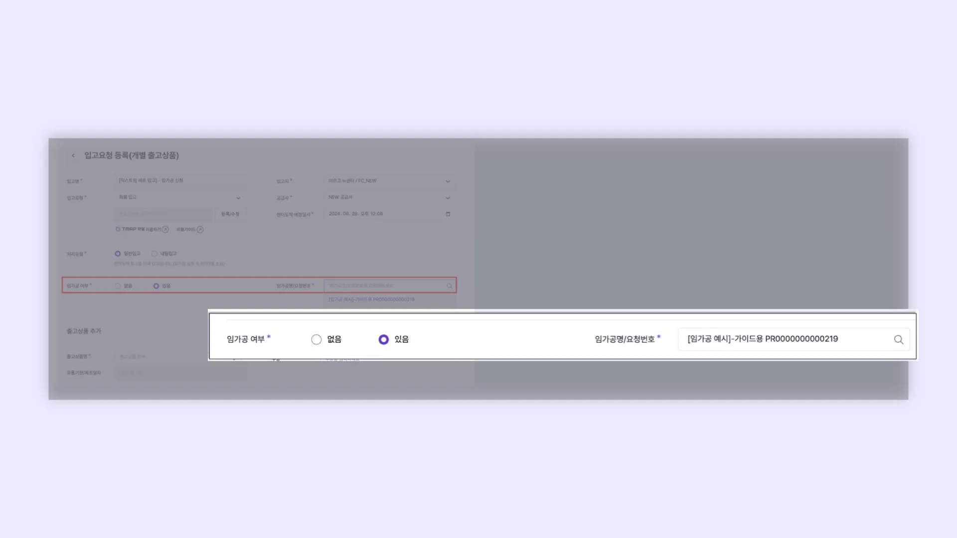 입고요청 등록에서 임가공 여부를 [있음]으로 선택 후 , 사전에 등록한 임가공명/요청번호를 선택해 매핑해주세요.