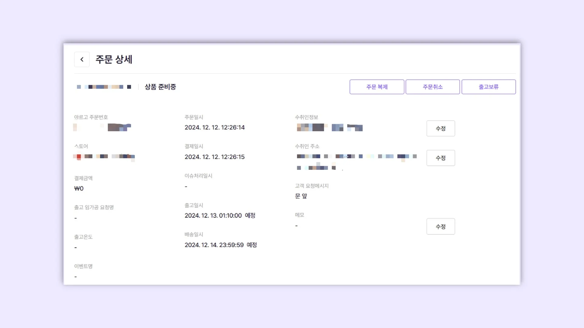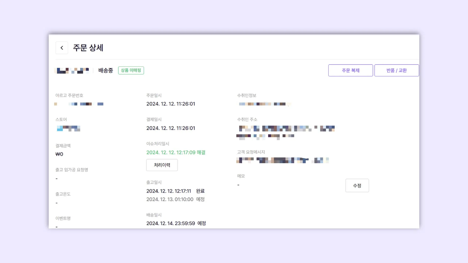 주문 > 주문조회 > 해당 주문번호 검색 > 주문번호 클릭