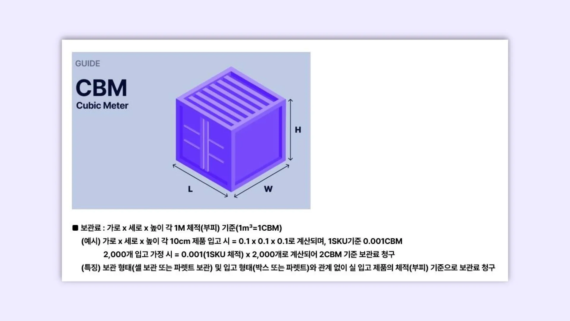 이 때 최고 부과 기준은 1CBM이며, 당사의 센터 보관량이 1CBM을 넘지 않더라도 최소 기준으로 비용이 부과돼요.