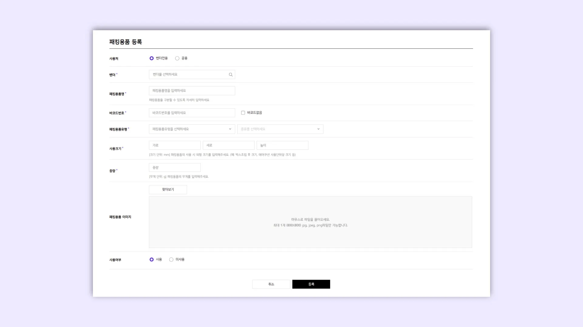사용여부: 해당 포장재를 등록 후 아르고에서 사용할지 여부를 선택해주세요.