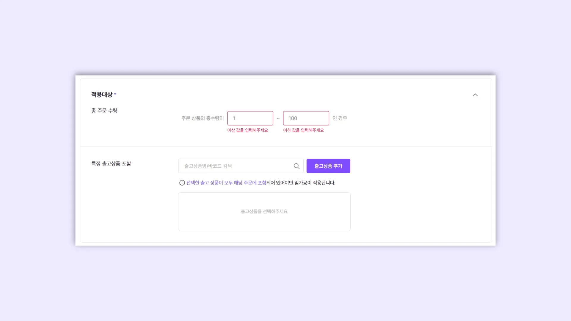 총 주문 수량: 주문에 포함된 총 수량 (SKU 종류 무관)을 조건으로 설정하며, 필수 입력사항이에요.