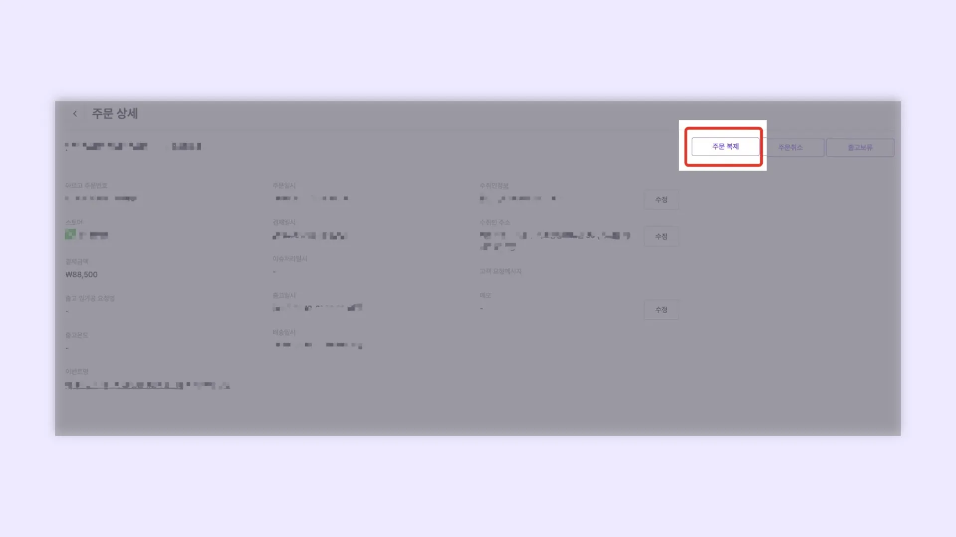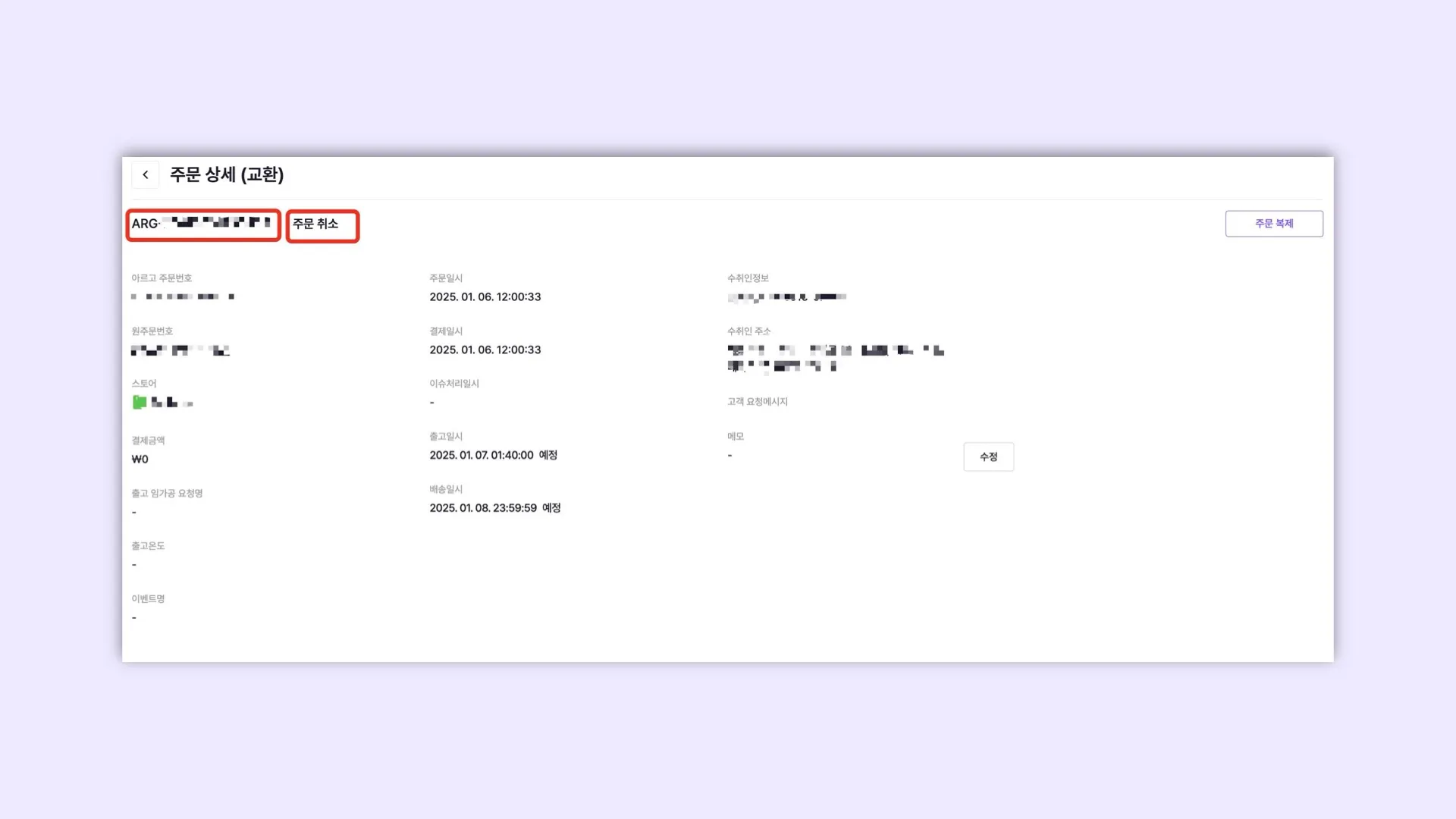 자동으로 생성된 ARG로 시작하는 교환번호는 [주문 취소] 처리