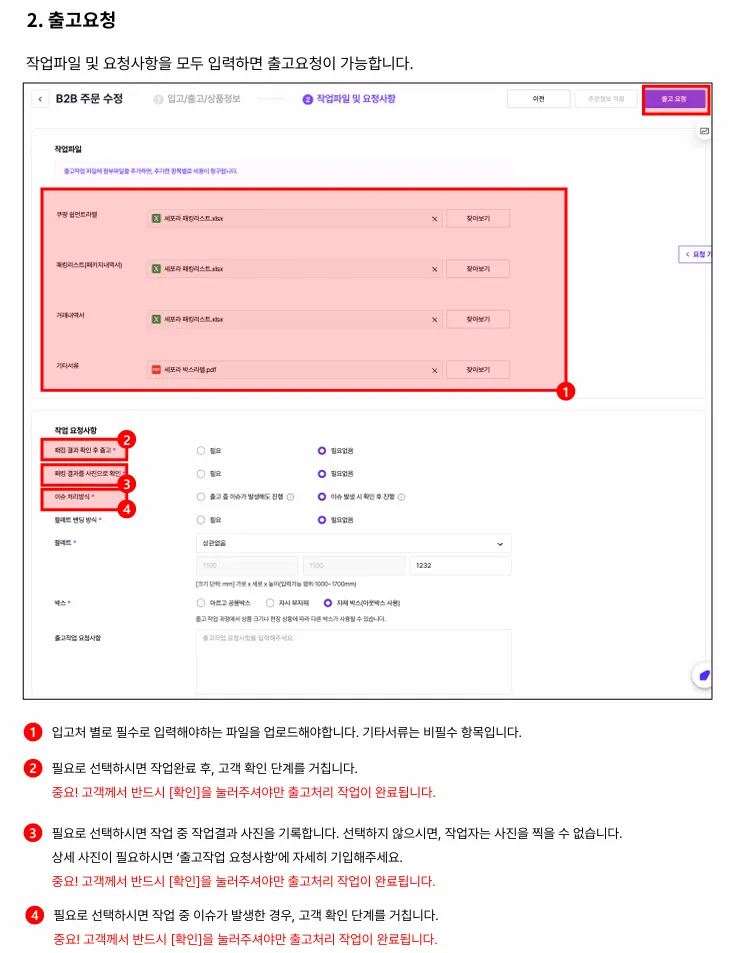 주문서 작성 완료 후 반드시 [출고승인 요청]을 클릭하여 센터로 접수해주세요!
