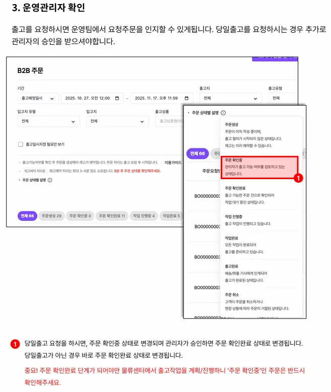 B2B 주문 생성 후 1일 이내 [출고승인 요청]을 하지 않은 경우 자동취소 되므로 반드시 유의해주세요!