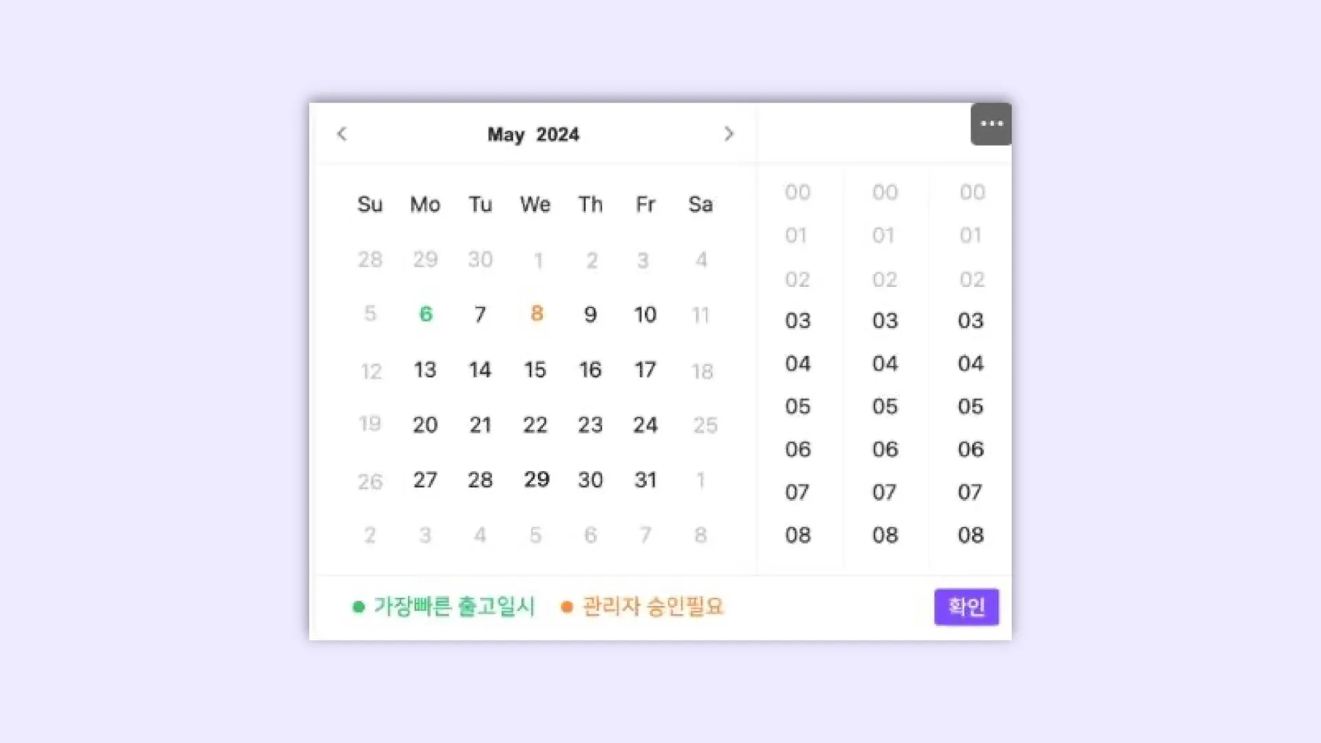 선택한 날짜가 캐파 여유가 있는 날짜인 경우 (초록색 또는 검정색 날짜) 자동으로 승인 처리되며