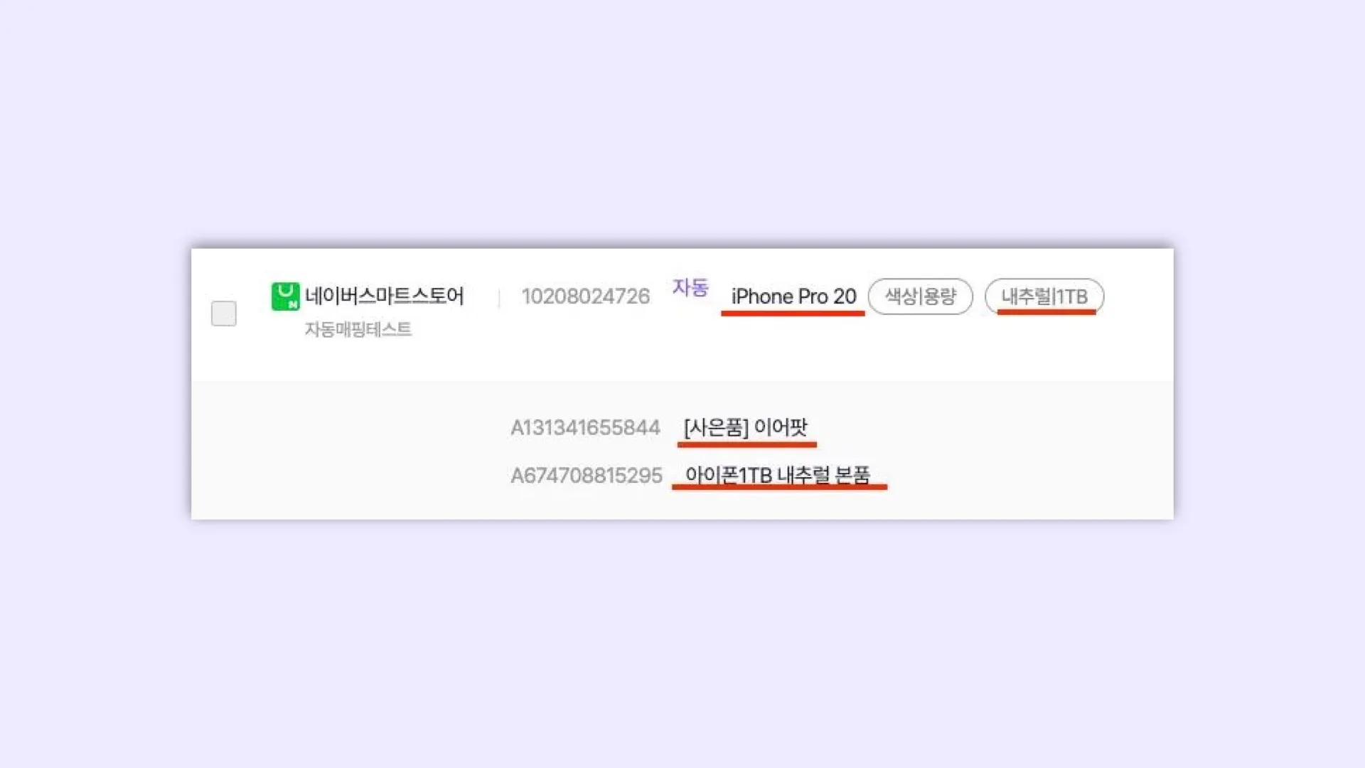 아래 iPhone Pro 20 내추럴 1TB 의 스토어 상품명+옵션명이 위에 등록한 키워드 설정과 일치하여, [사은품] 이어팟, 아이폰1TB 내추럴 본품 출고 상품들이 자동 매핑되었어요.