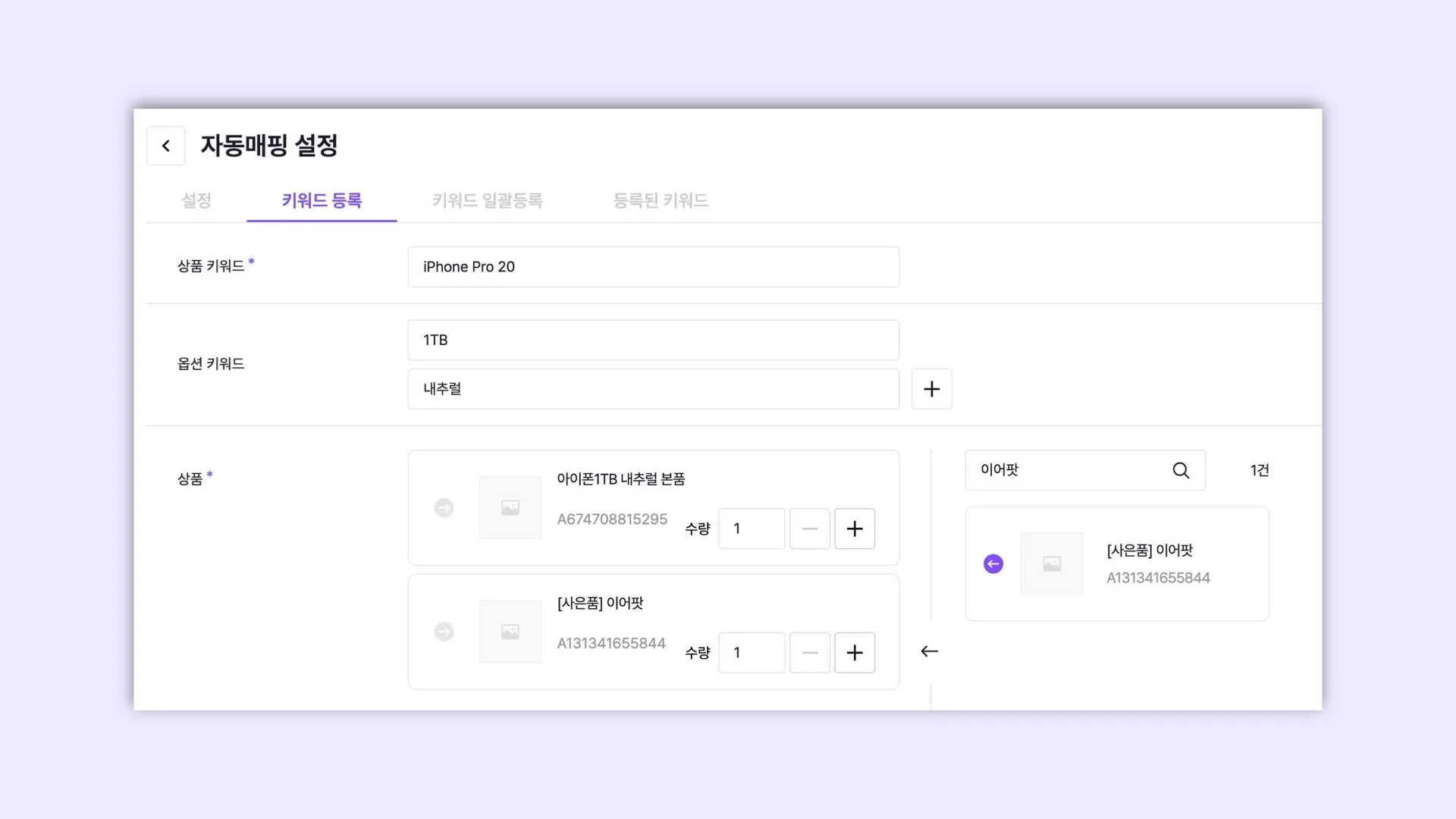 키워드와 해당 키워드에 매핑될 출고상품들이 무엇인지 설정하셔야 해요.