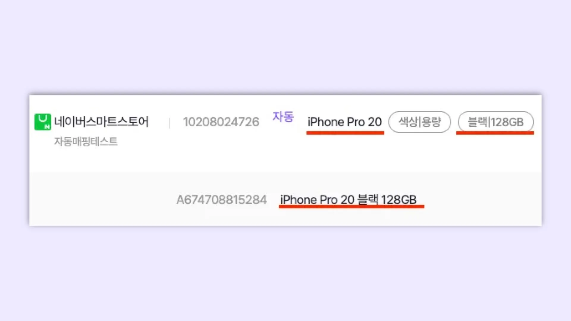 아래 예시와 같은 경우 위 조건에 부합되어 스토어 상품 수집시 자동 매핑되어요.