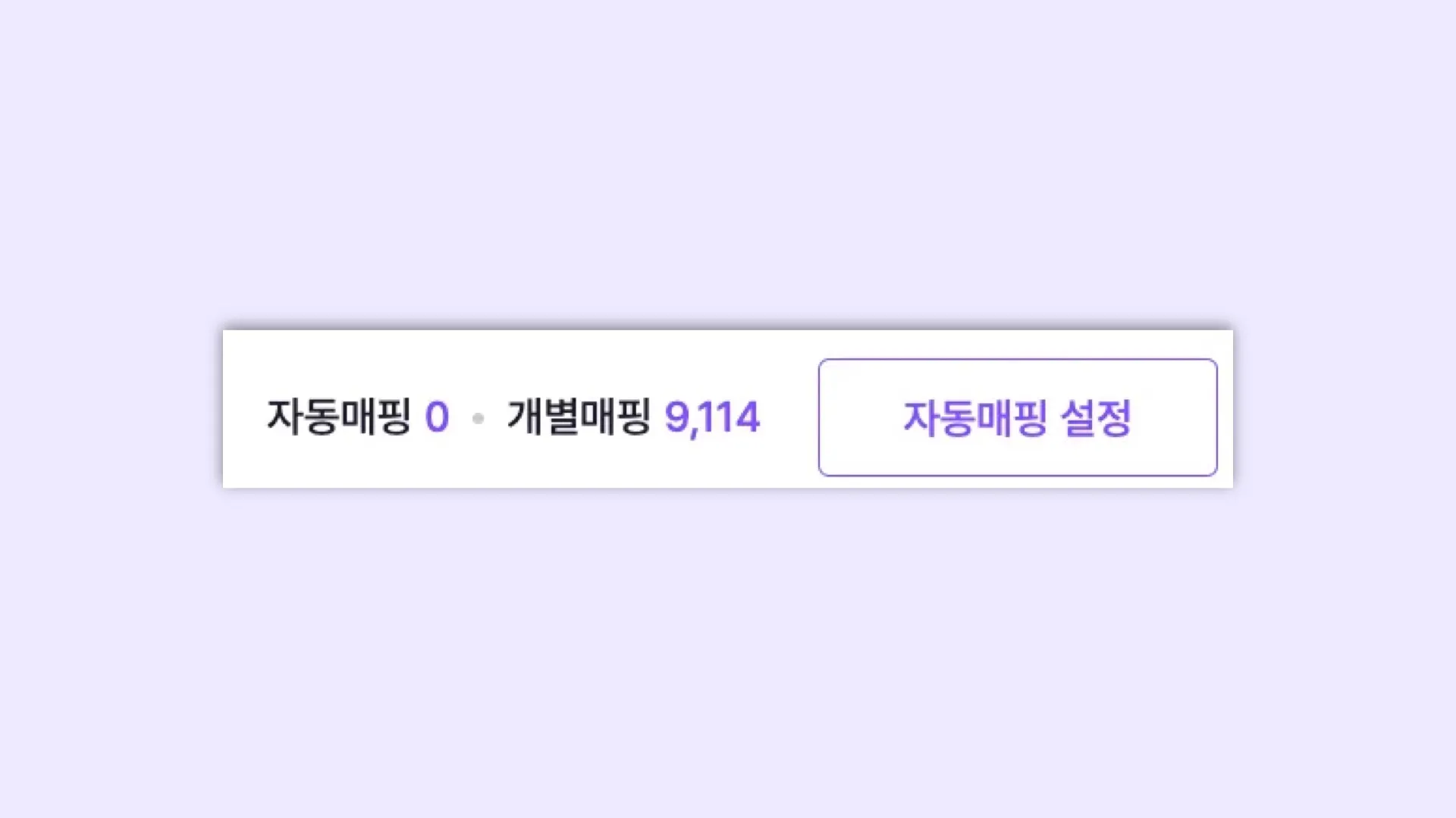 자동매핑 설정 좌측에서 자동매핑 된 스토어상품의 갯수와 수동으로 매핑하신 스토어상품의 개수를 확인하실 수 있어요.