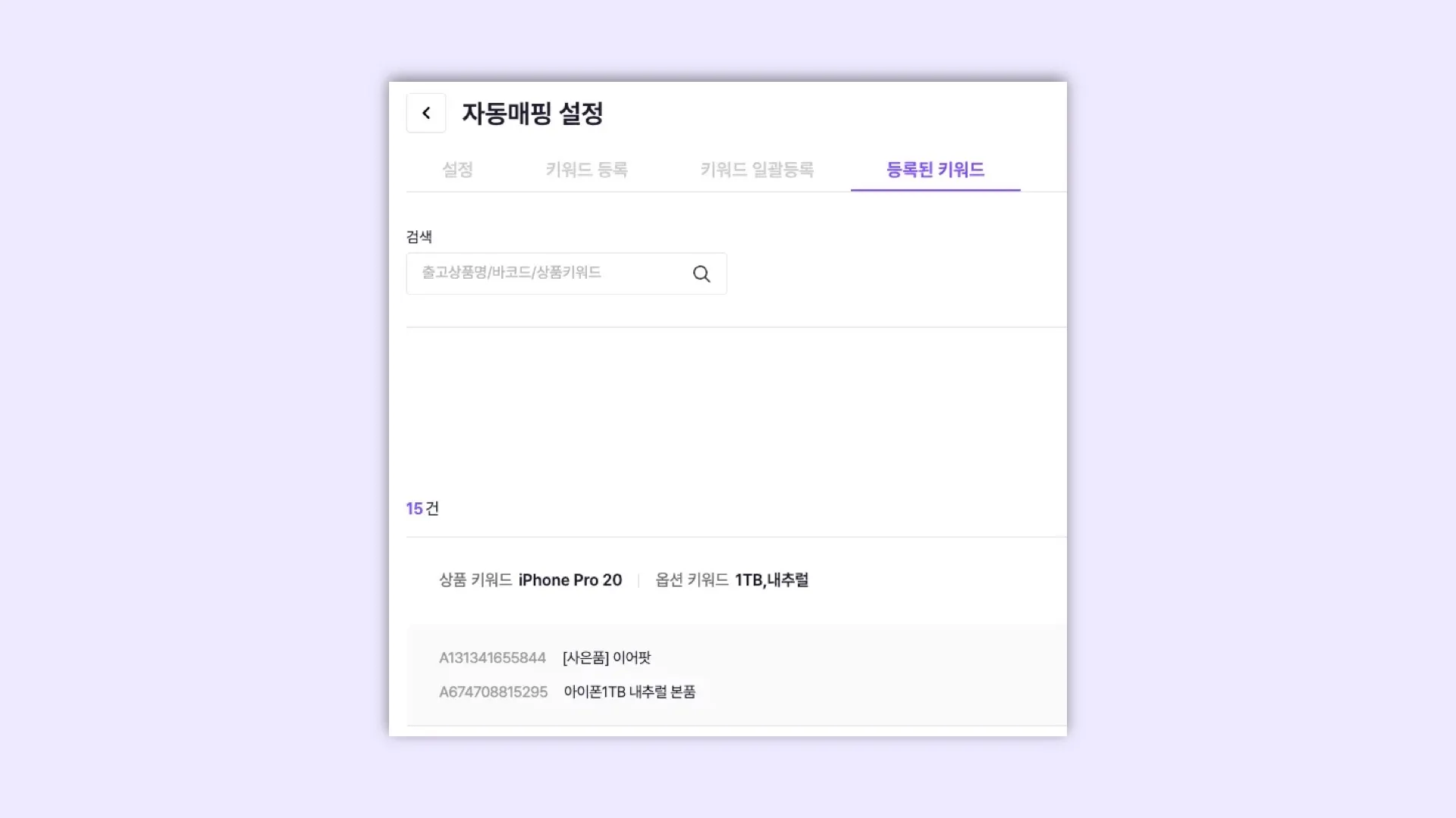 등록된 키워드 탭에서 등록하신 키워드들과 매핑된 출고 상품 목록을 확인할 수 있어요.