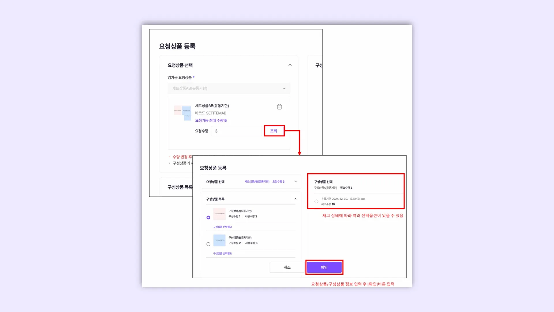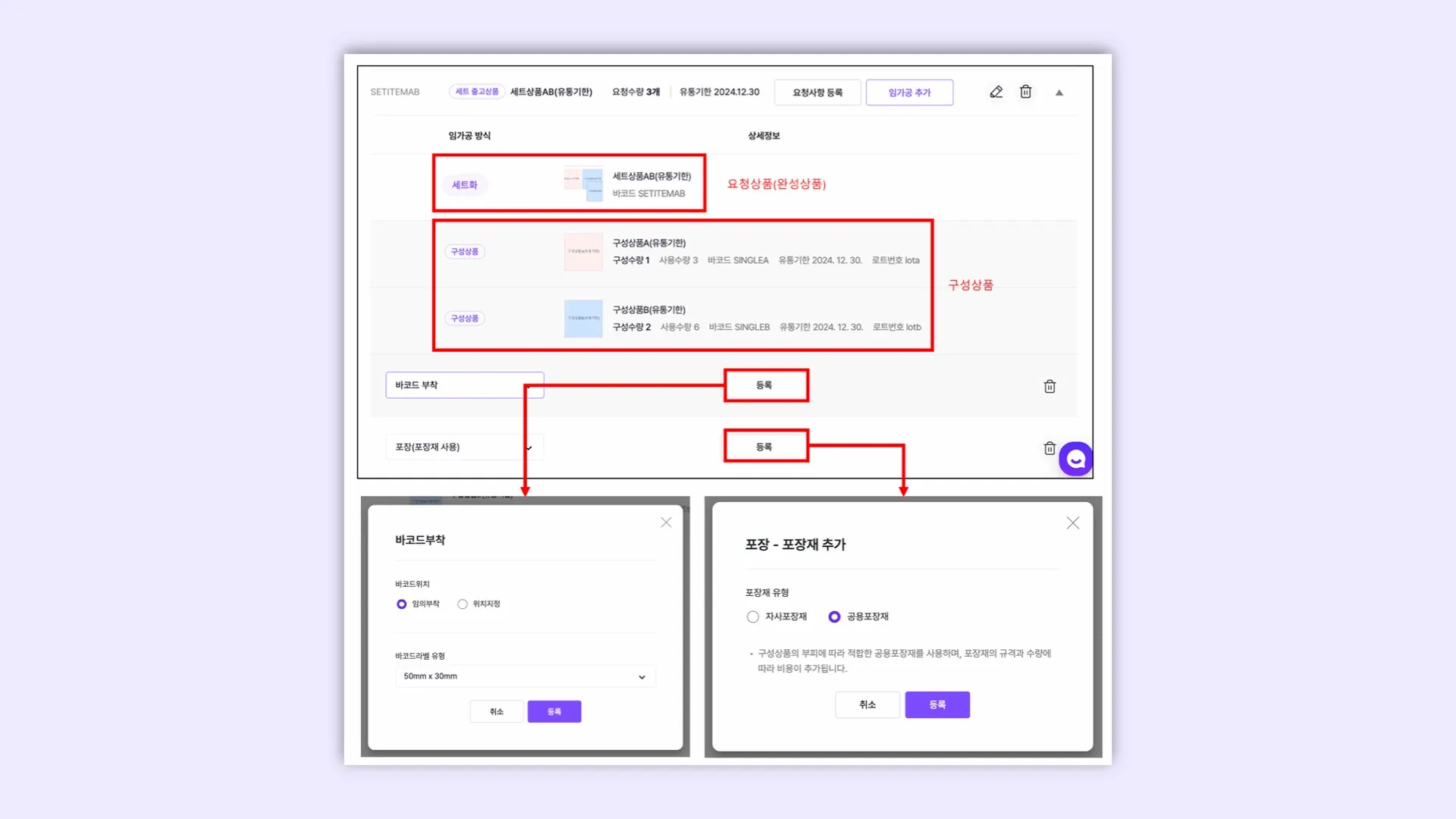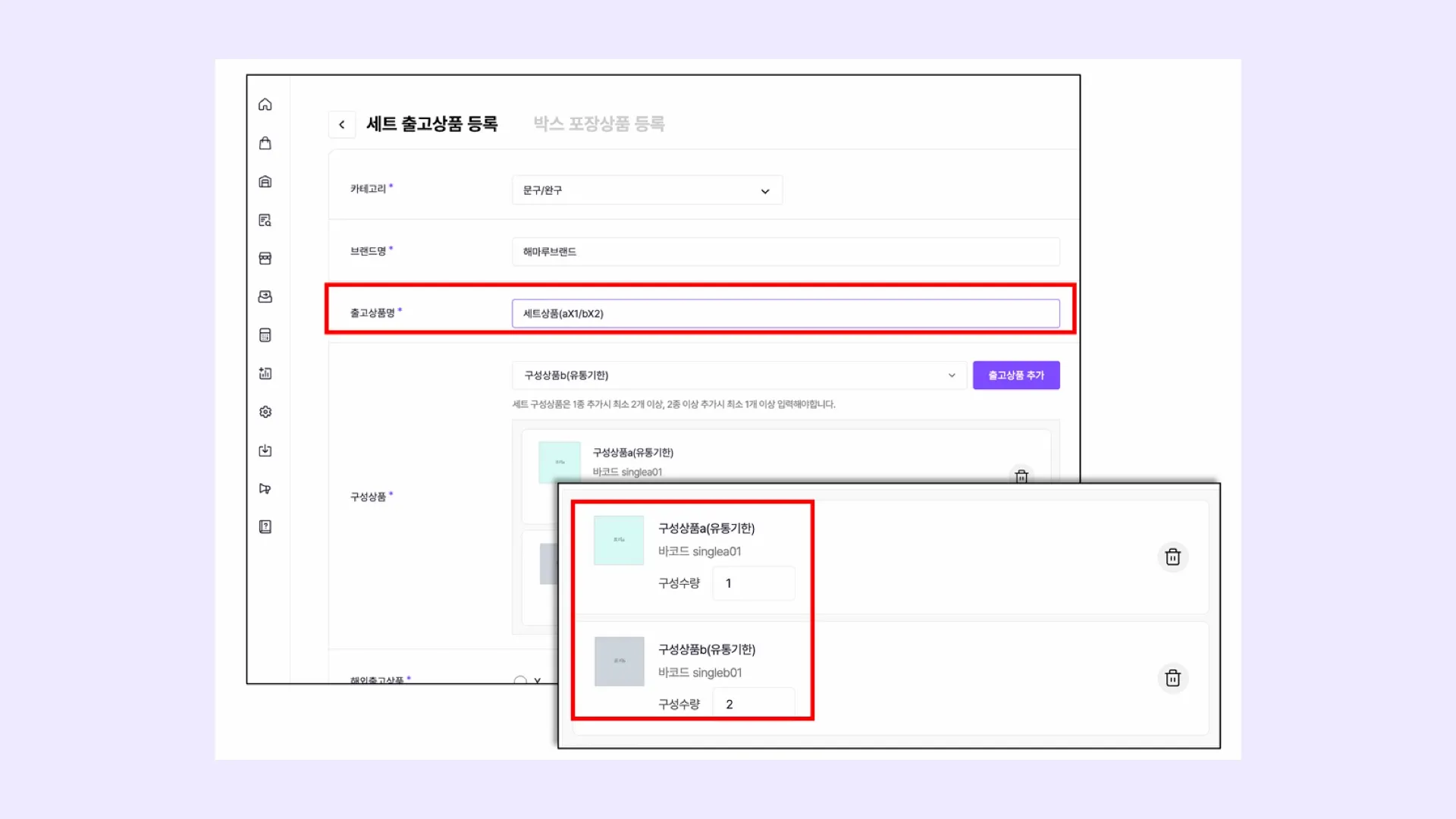 구성상품a 1개와 구성상품b 2개를 조합해 세트상품 1개를 만들기 위한 임가공 작업을 요청하기 전에 위와 같이세트 출고상품을 미리 등록해주세요.