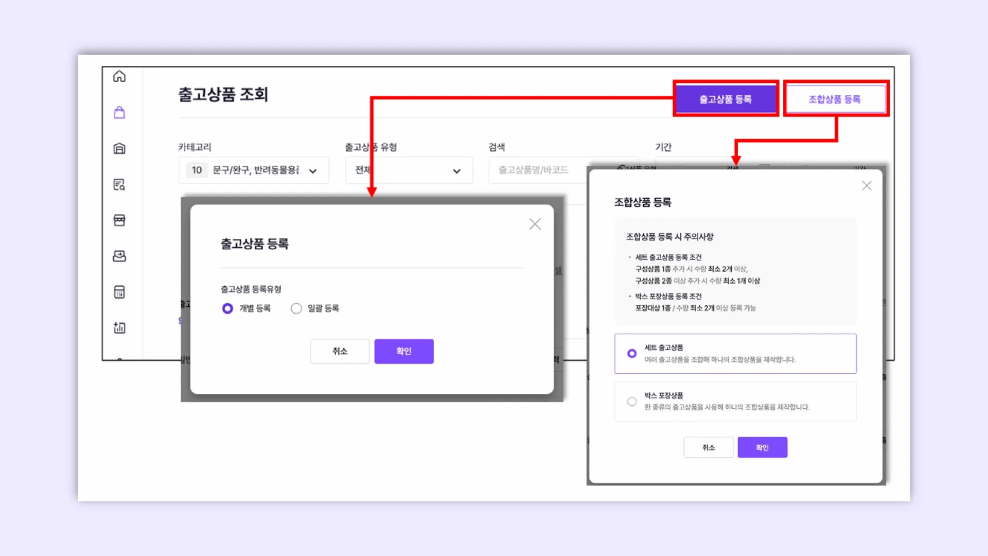 단일출고상품과 조합상품(세트출고상품또는박스포장상품)을 등록하실 수 있어요.