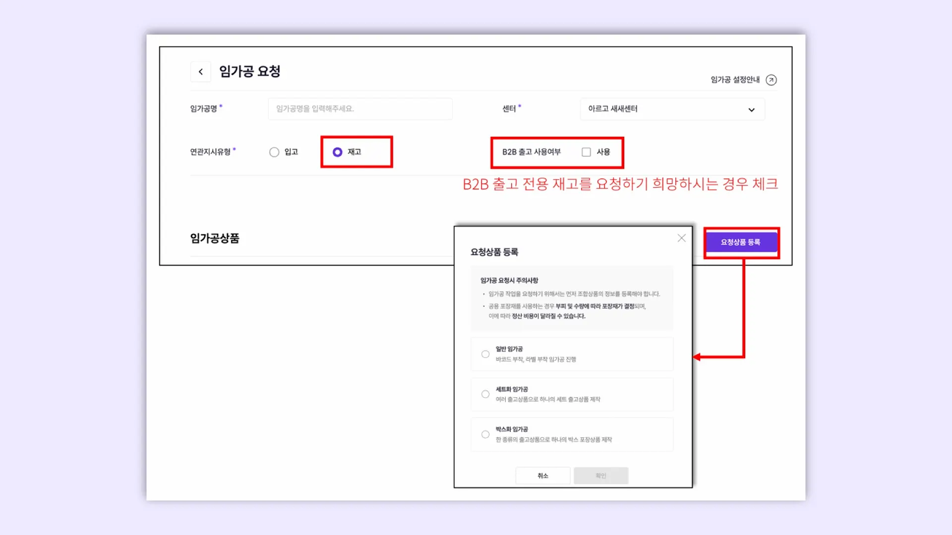[요청상품등록] 버튼을 입력하면 표시되는 모달창에서 요청하실 임가공 방식을 선택해주세요.