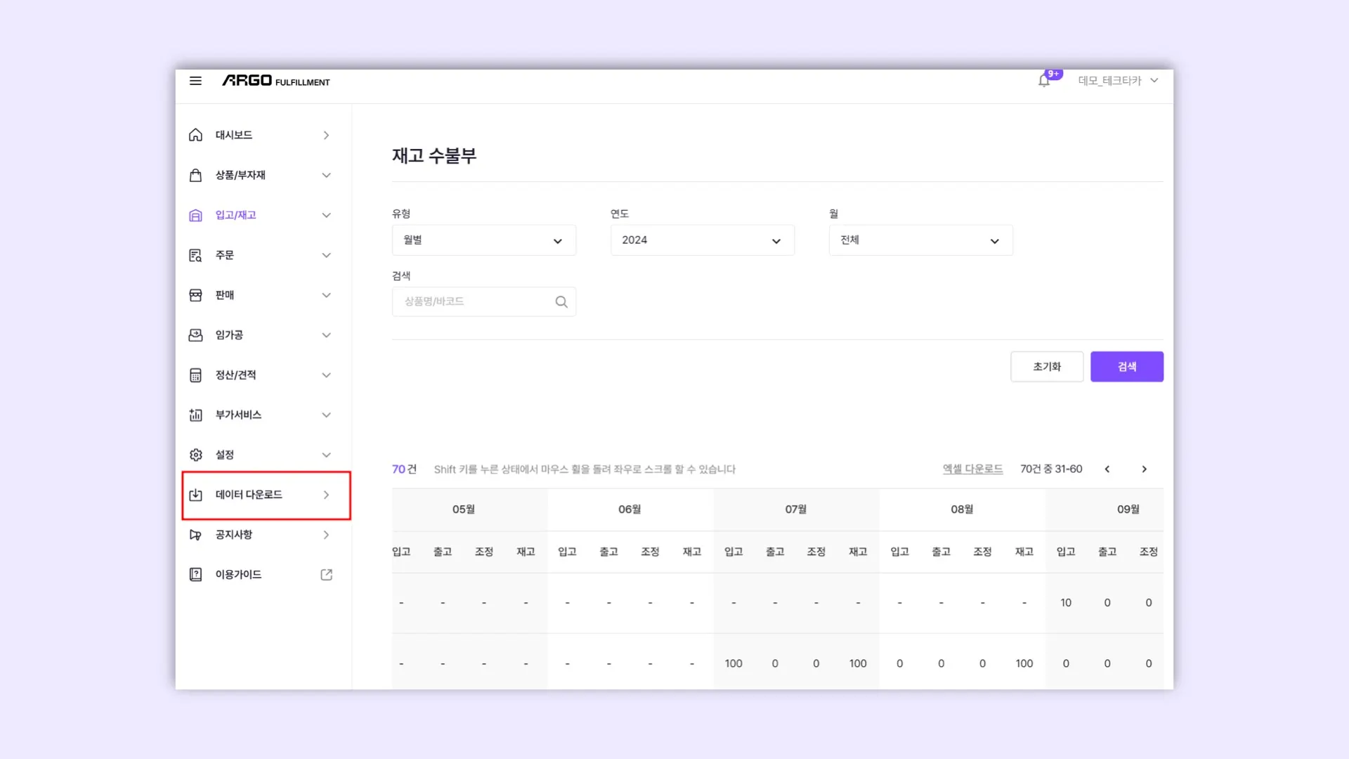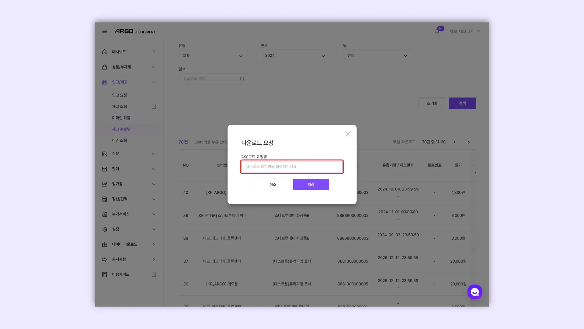 다운로드 요청명 기재 후 저장하면, 좌측 [데이터 다운로드] 탭에서 최종 확인할 수 있어요.