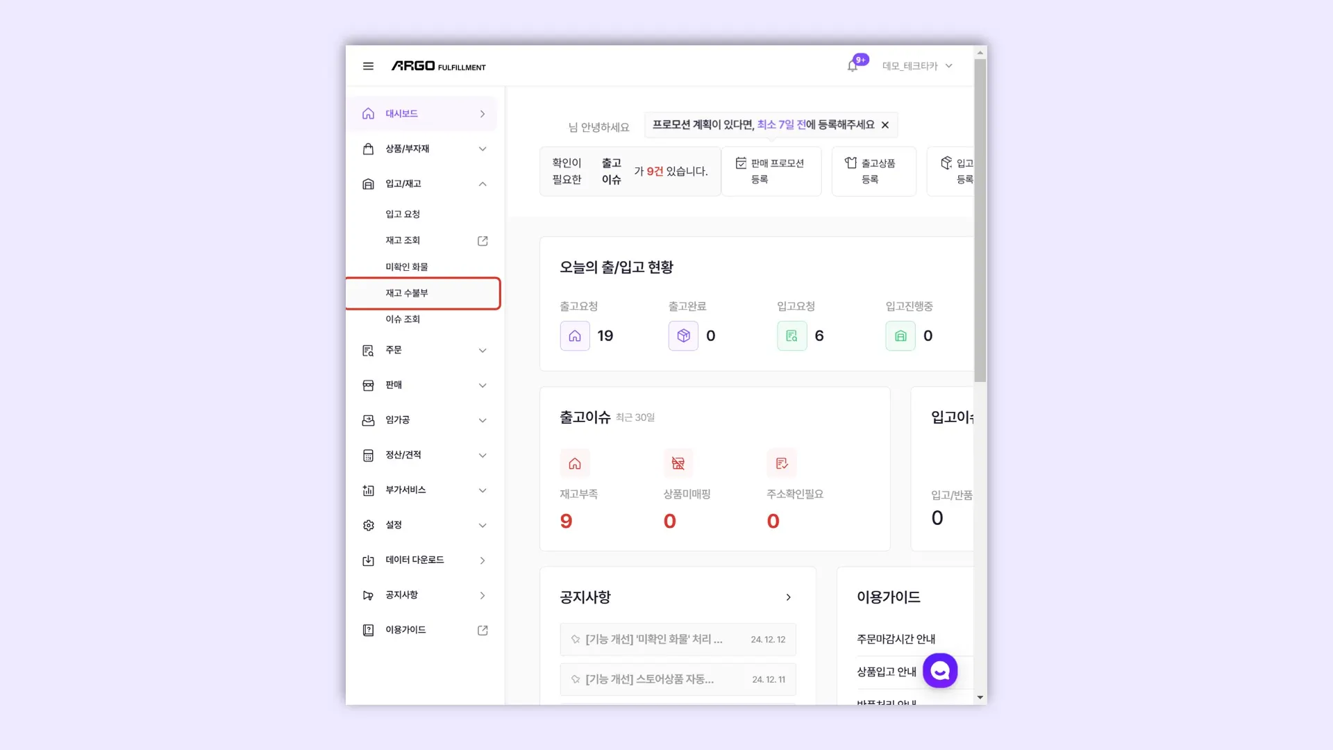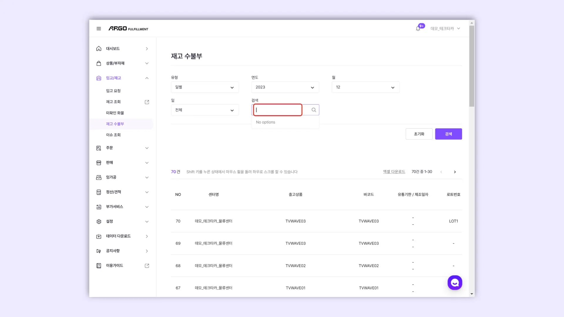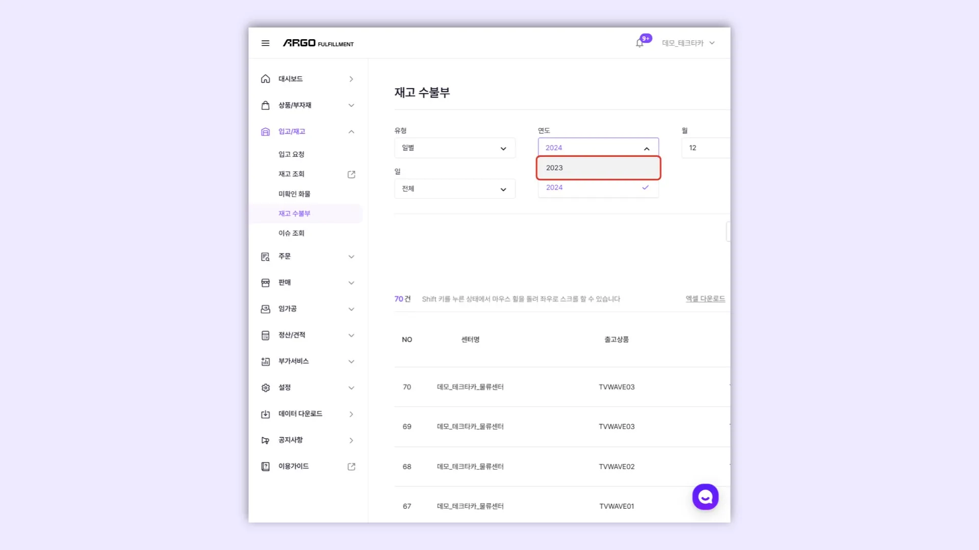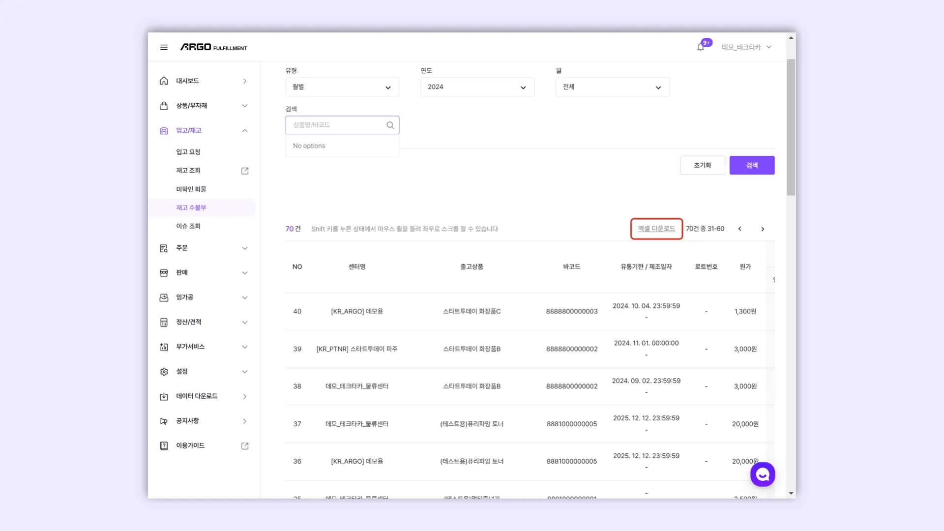 좌측 메뉴 [입고/재고] - [재고 수불부] 클릭!