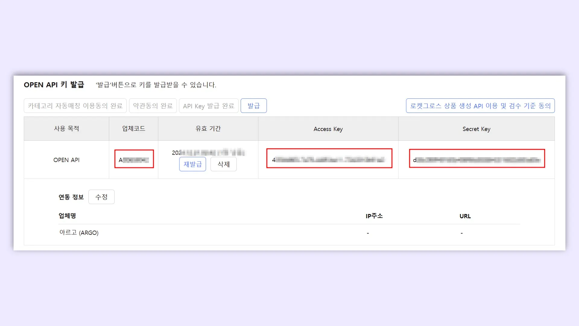 OPEN API 키 발급에서 연동업체 선택에서 [아르고(ARGO)] 를 선택해주세요.