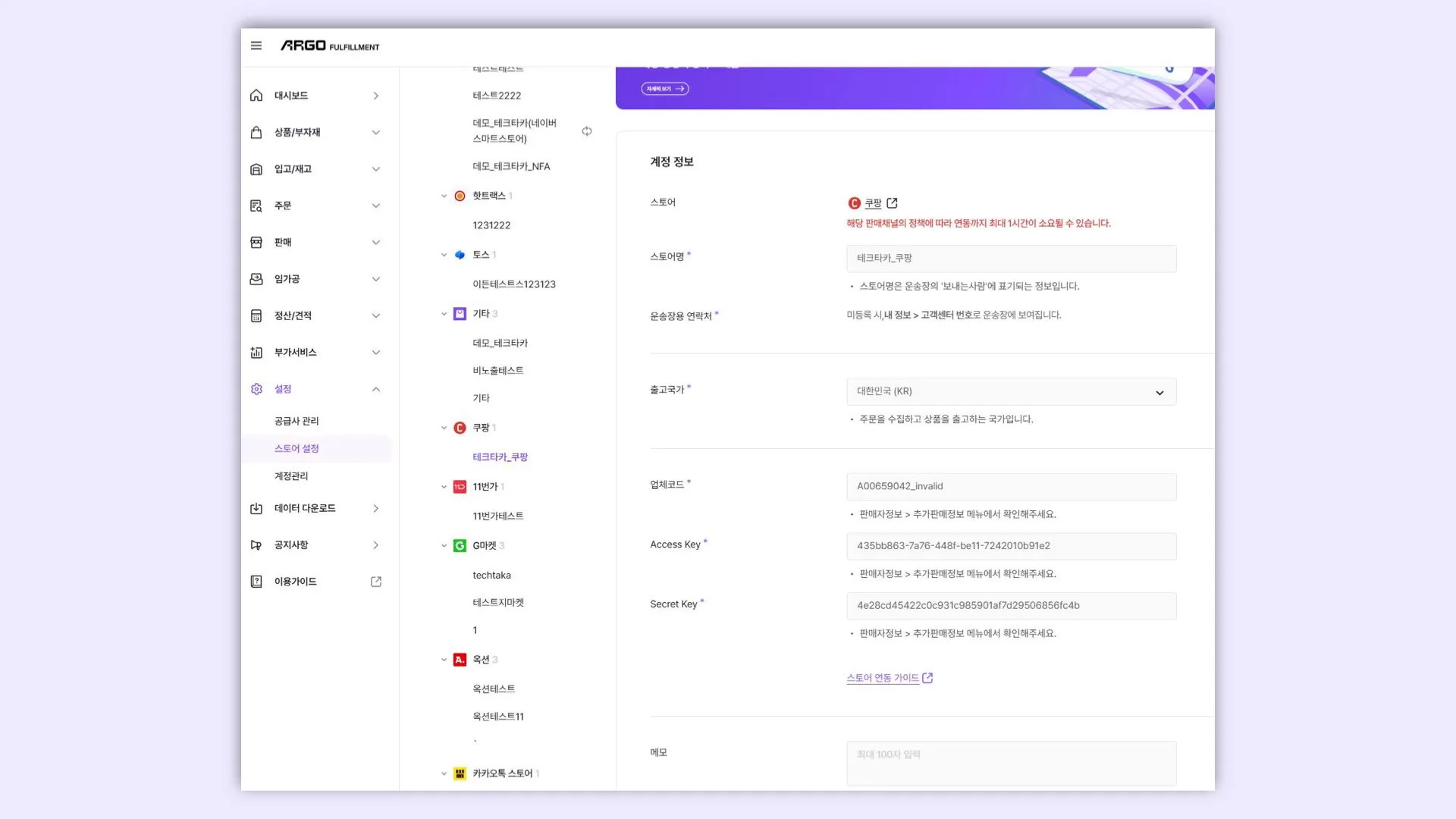 ARGO 좌측 메뉴 → 설정 → 스토어 관리 → 스토어 설정에 연동을 위한 키를 입력 후 저장하세요.