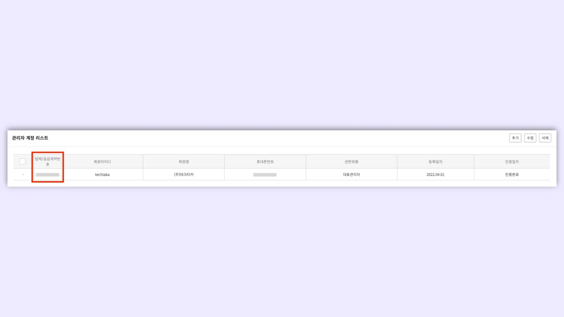 [판매자 정보 관리] - [관리계정(ID)관리] 의 업체/공급계약번호를 복사해주세요.