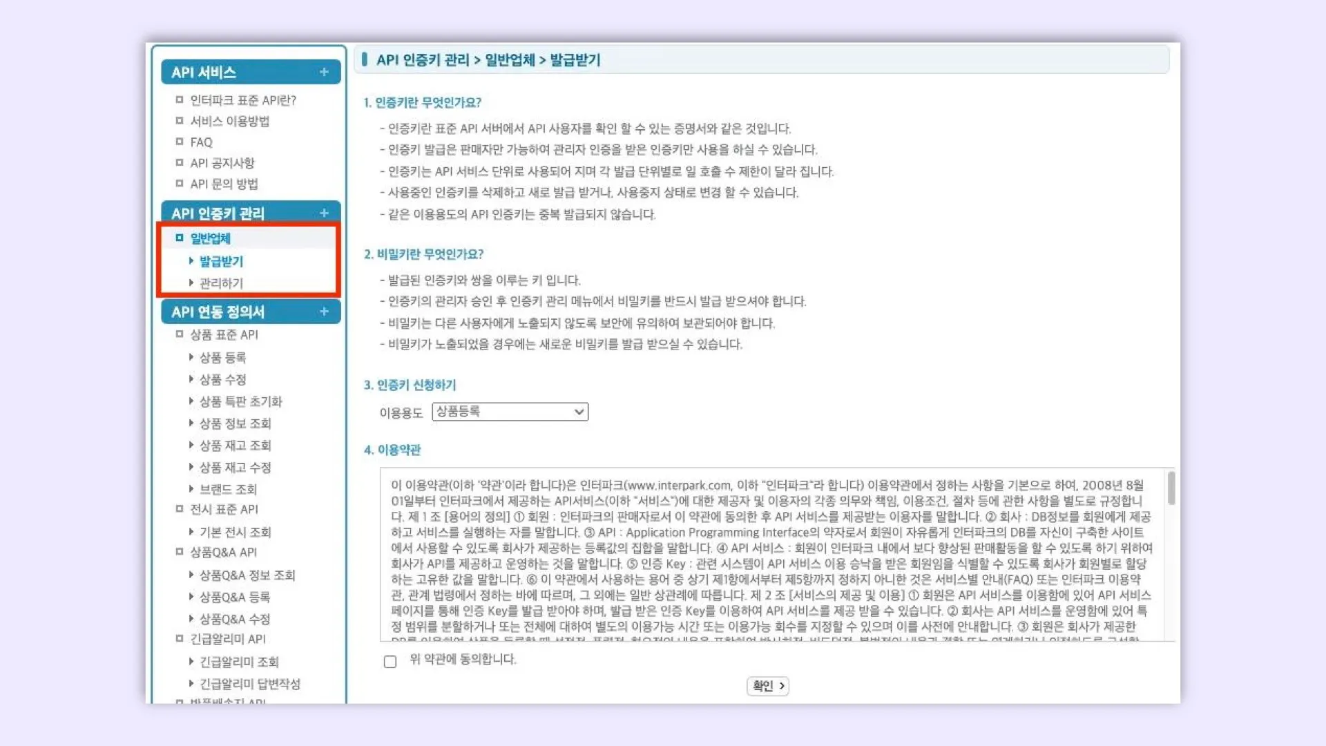 API 인증키 관리 - 일반업체 - [발급받기] 에서