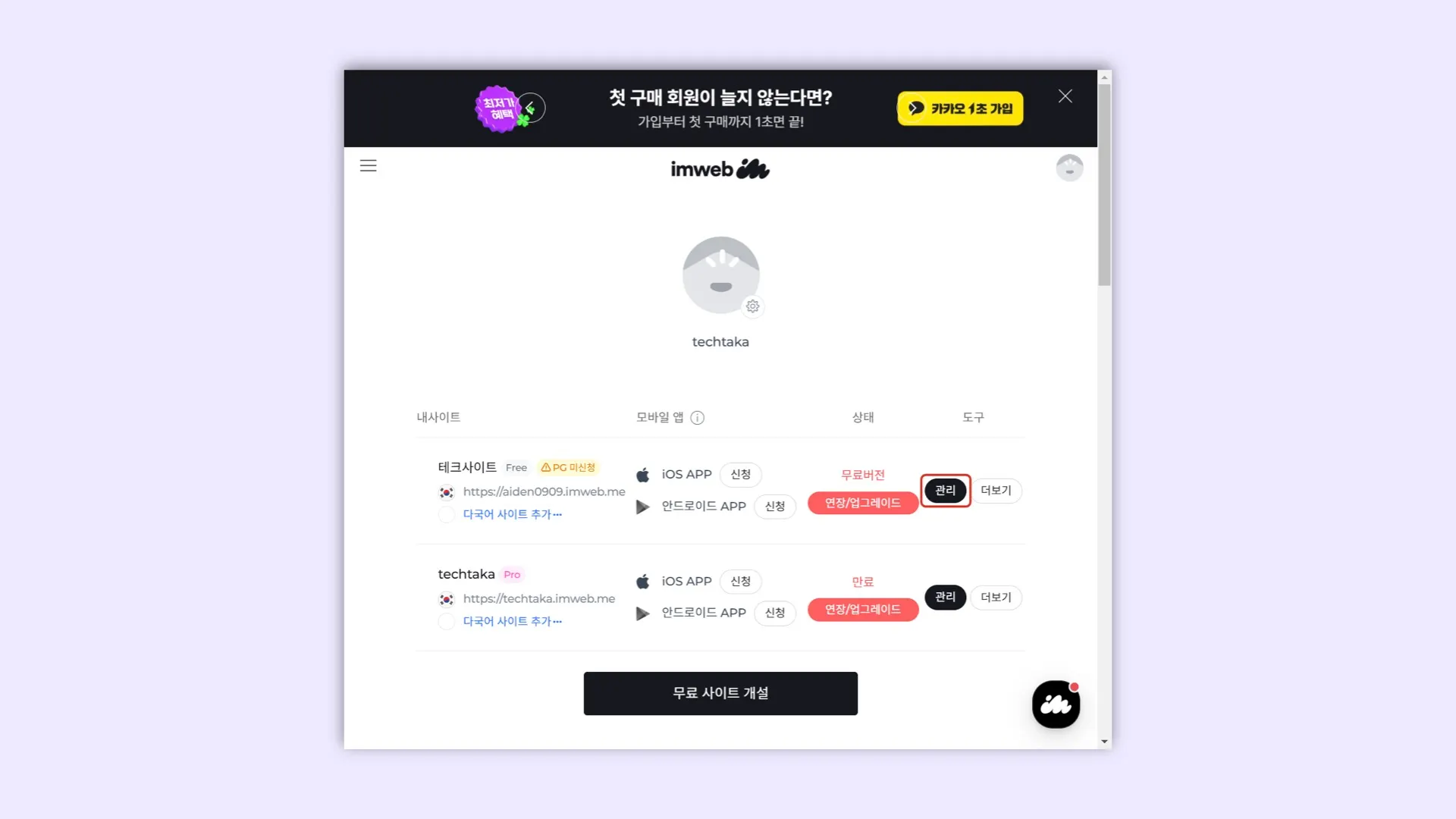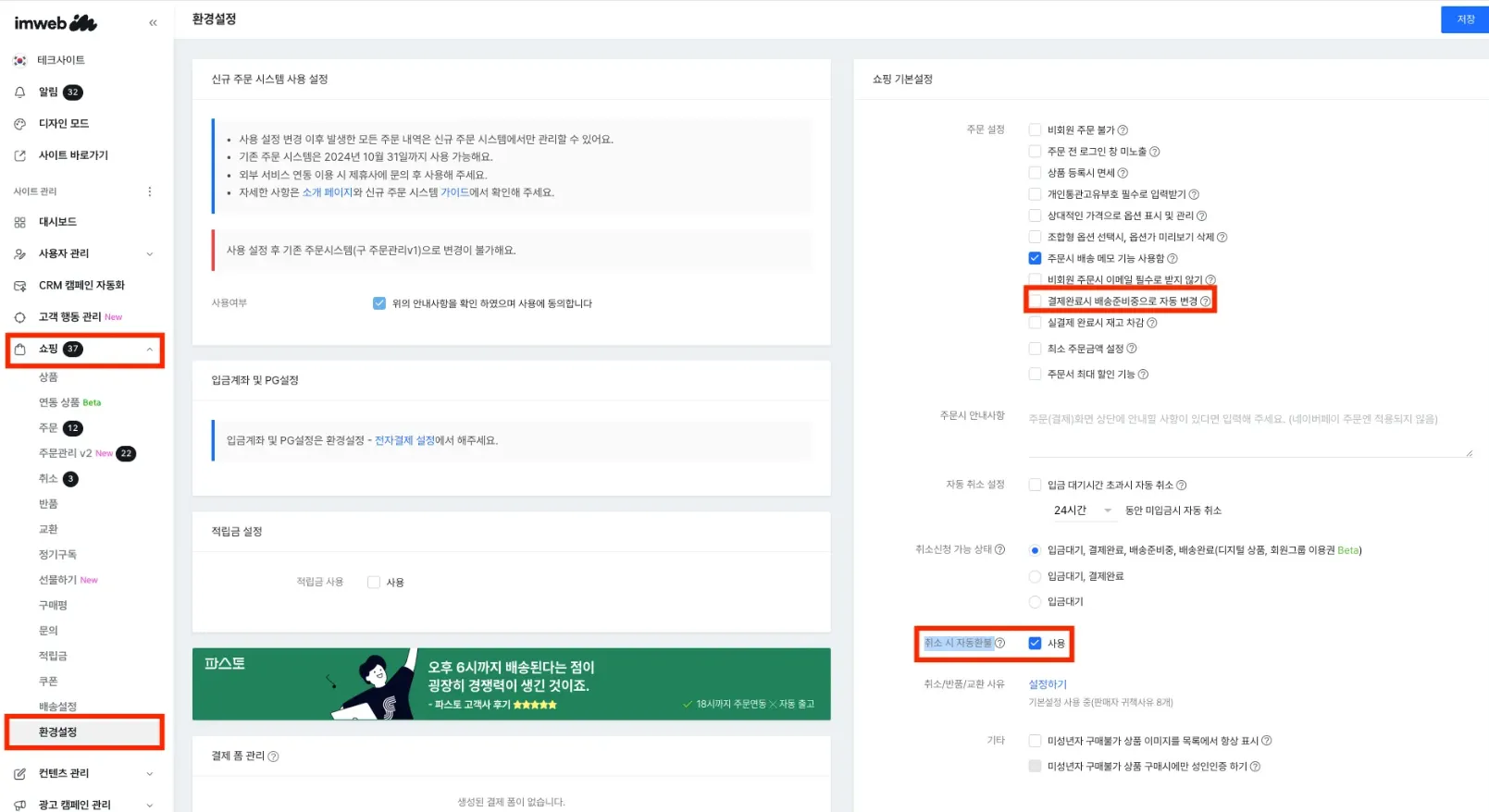 아임웹 관리자 센터 - 쇼핑 - [환경설정]
