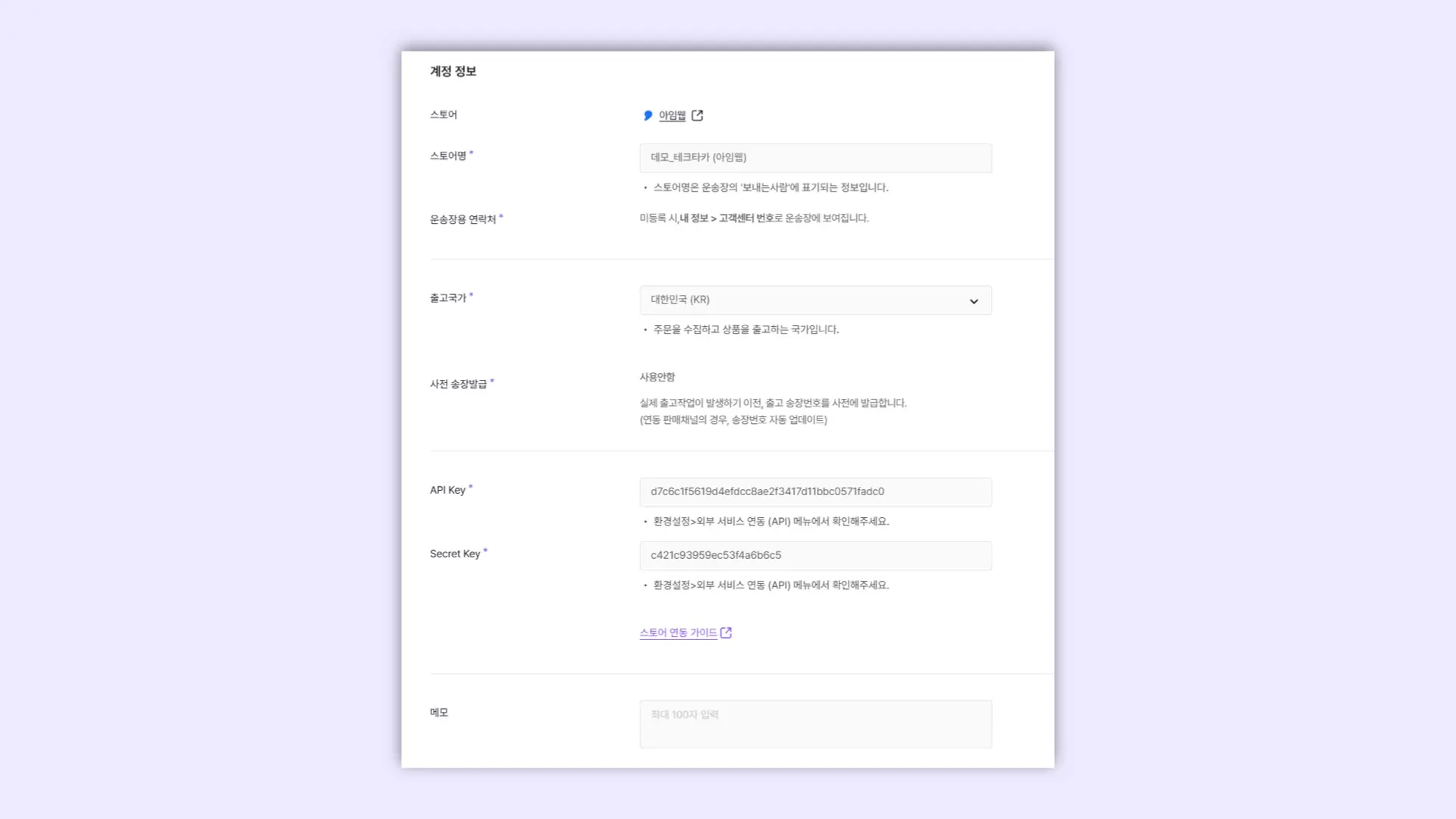 환경설정 > 외부 서비스연동 (API) 메뉴에서 API Key, Secret를 복사