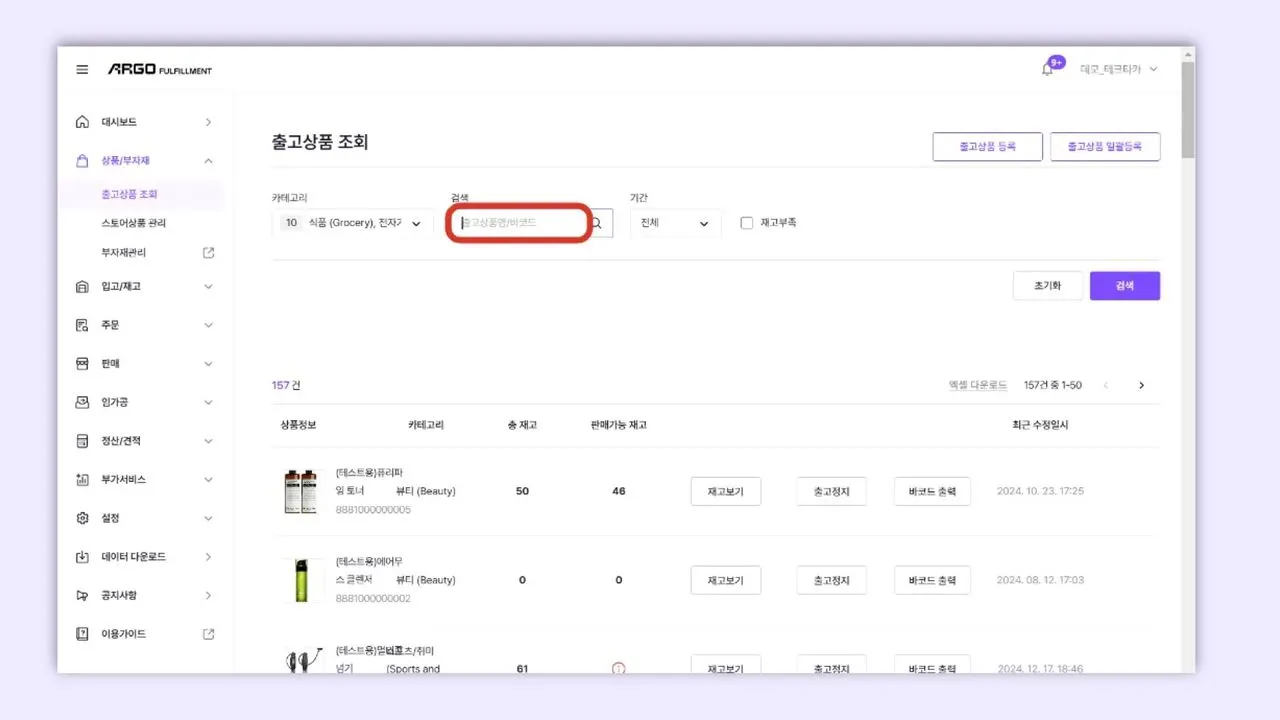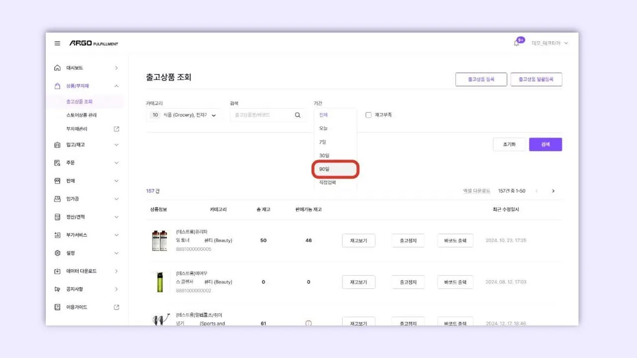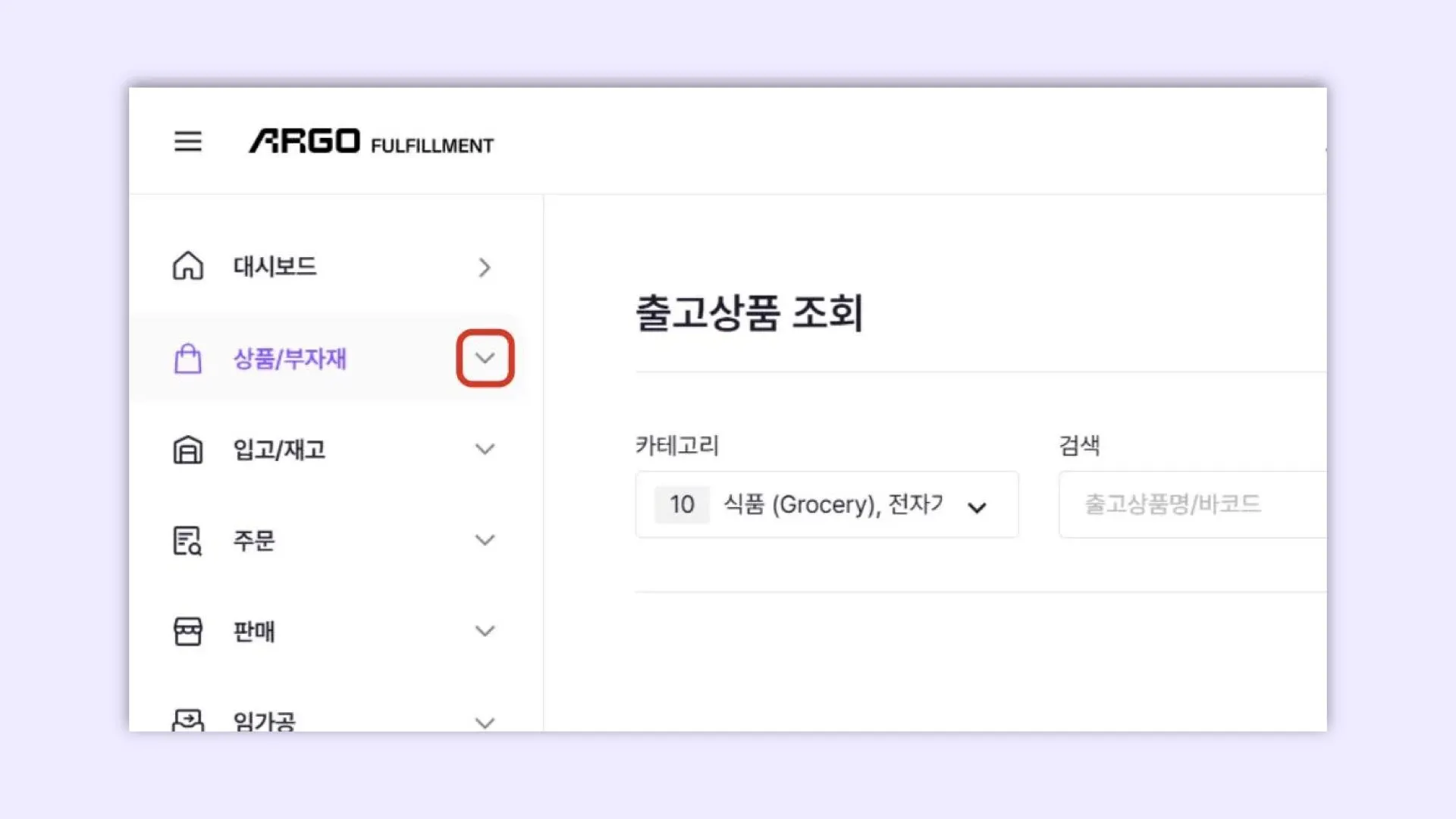아르고 홈페이지 좌측 상품/부자재 메뉴를 펼쳐
