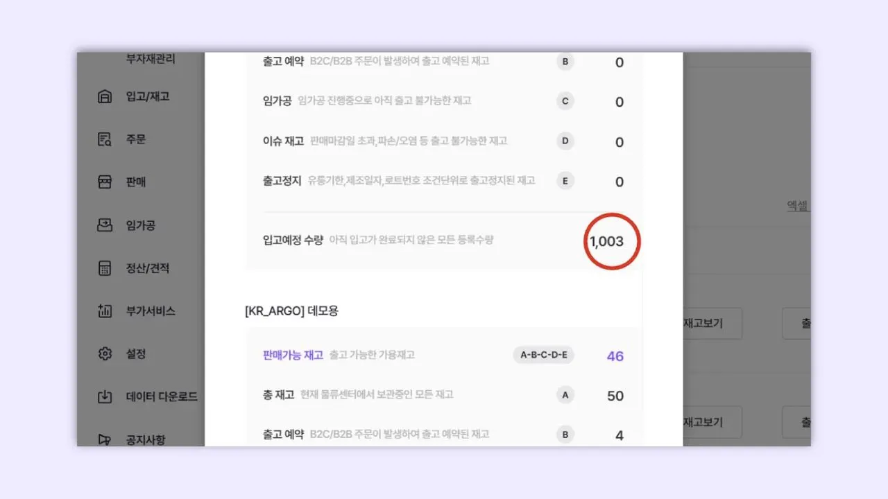 이슈 수량은 전산상 입고이력이 있으나, 파손/훼손/분실 등으로 인해 출고가 불가한 상태를 말해요. 자세한 이슈 내용은 입고/재고 - 이슈 조회 탭에서 사진과 함께 확인하실 수 있어요.