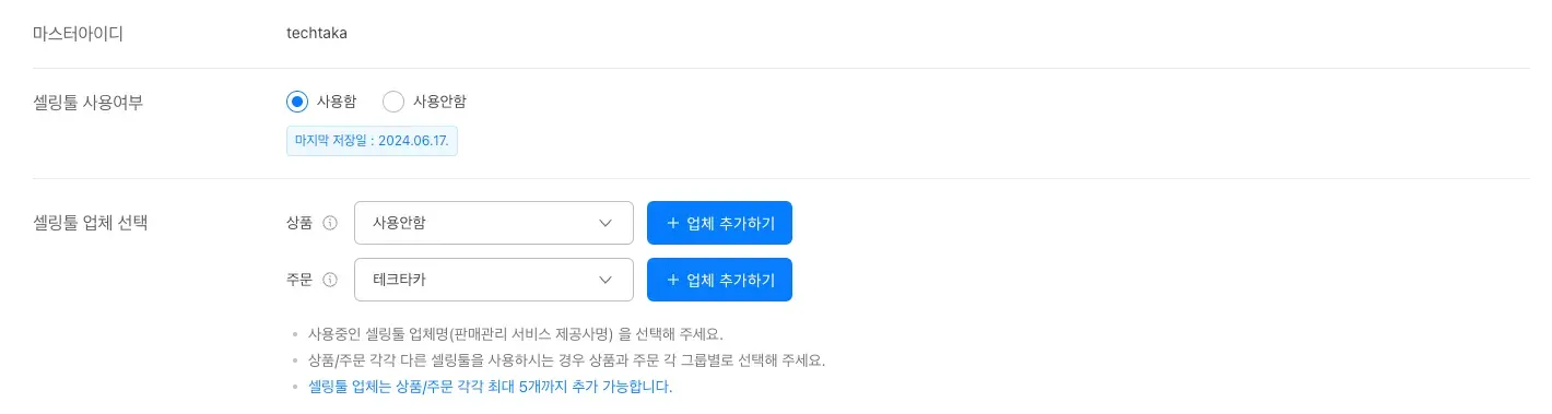 셀링툴 관리 메뉴의 업체 선택을 상품, 주문 모두 테크타카로 변경해주세요.