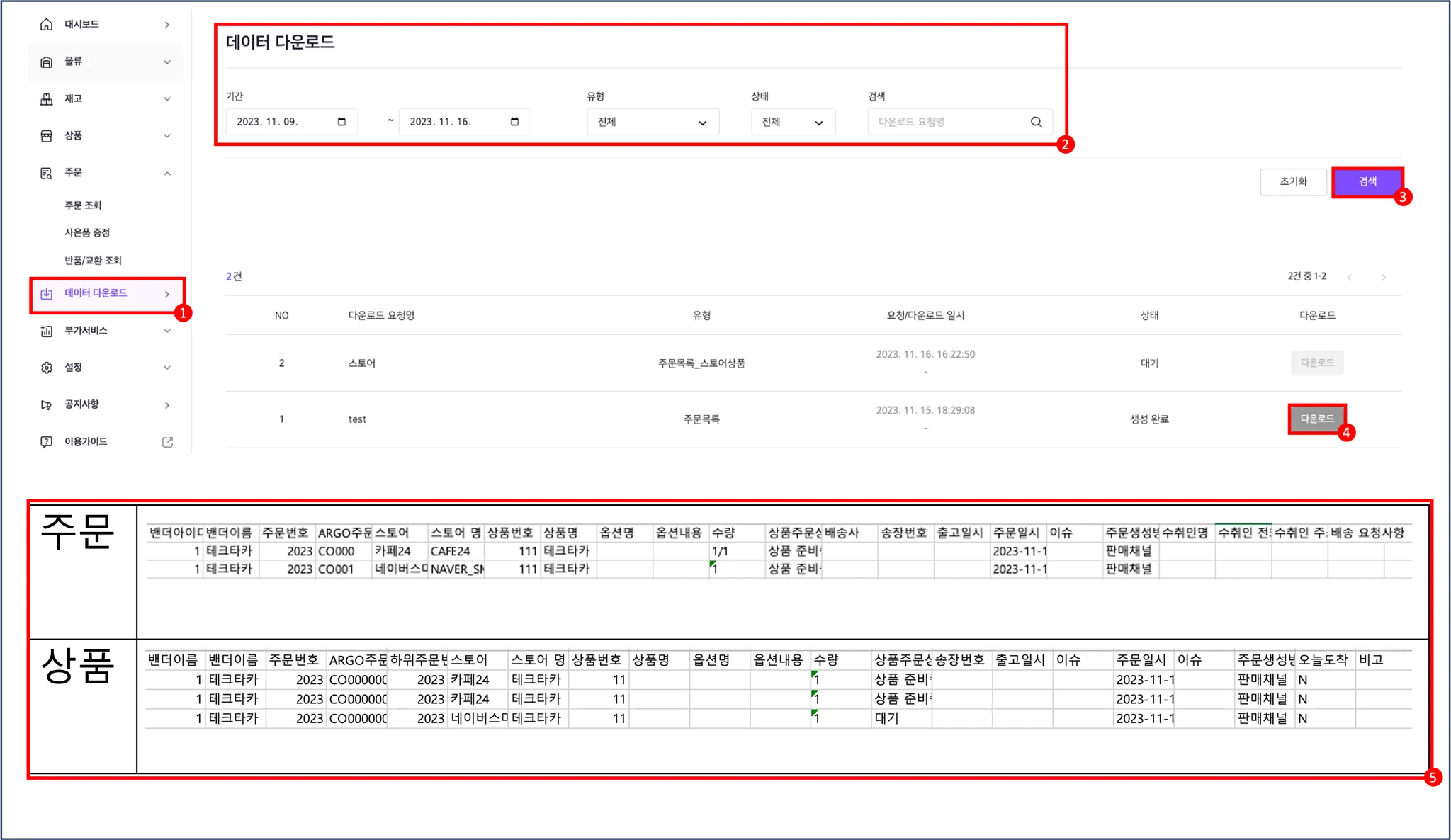 ARGO FULFILLMENT → 데이터 다운로드 화면에서 다운로드 요청하신 항목을 확인할 수 있습니다.