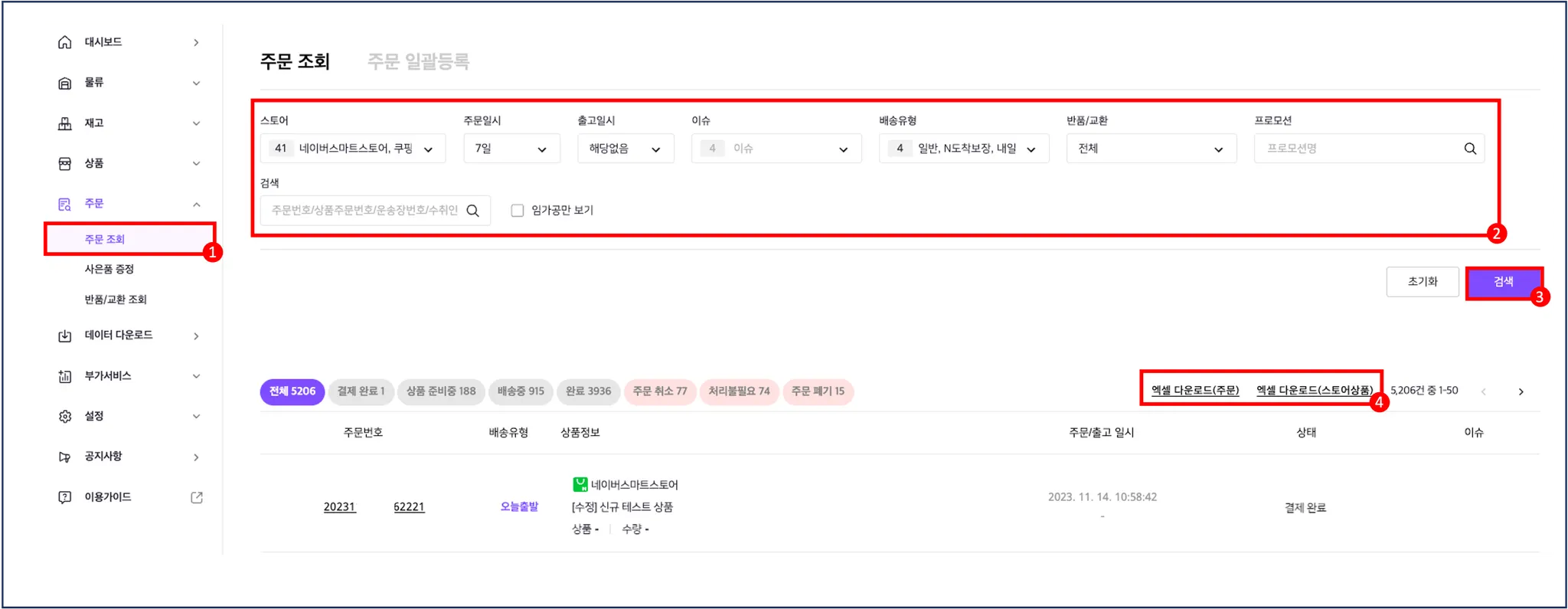 ARGO FULFILLMENT → 주문 조회 → 조건 설정(스토어,주문일시 등) → 검색 버튼을 클릭합니다.