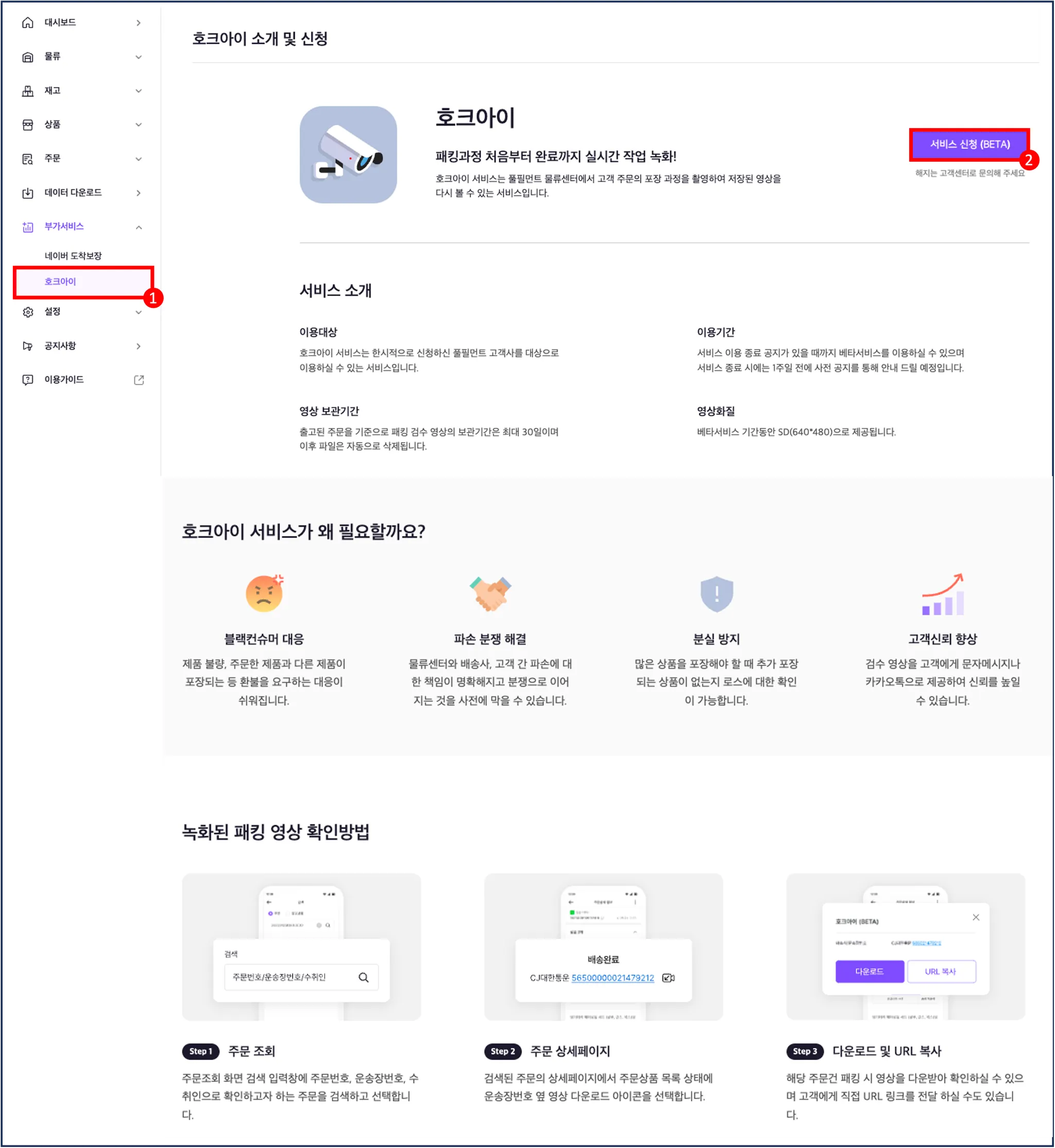 ARGO FULFILLMENT → 부가서비스 → 호크아이 를 클릭해주세요.