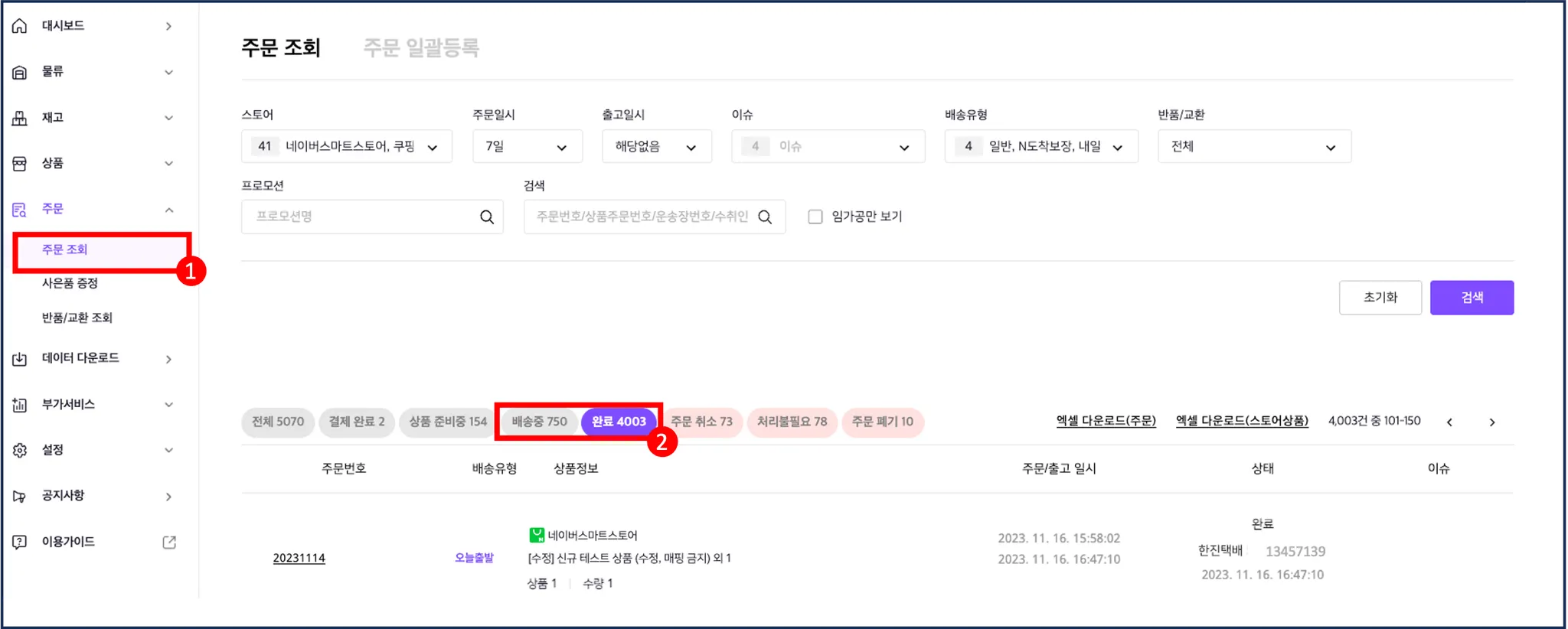ARGO FULFILLMENT → 주문 → 주문 조회 → [배송중 or 완료] 상태 탭을 클릭해주세요.