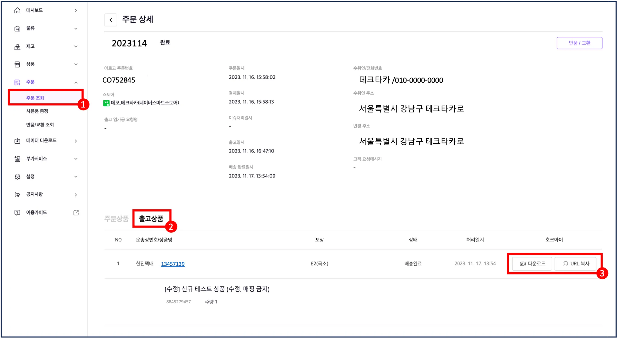 ARGO FULFILLMENT → 주문 → 주문 조회 → 주문 상세 → 출고 상품 탭에서 다운로드/URL 복사 버튼을 클릭해주세요.