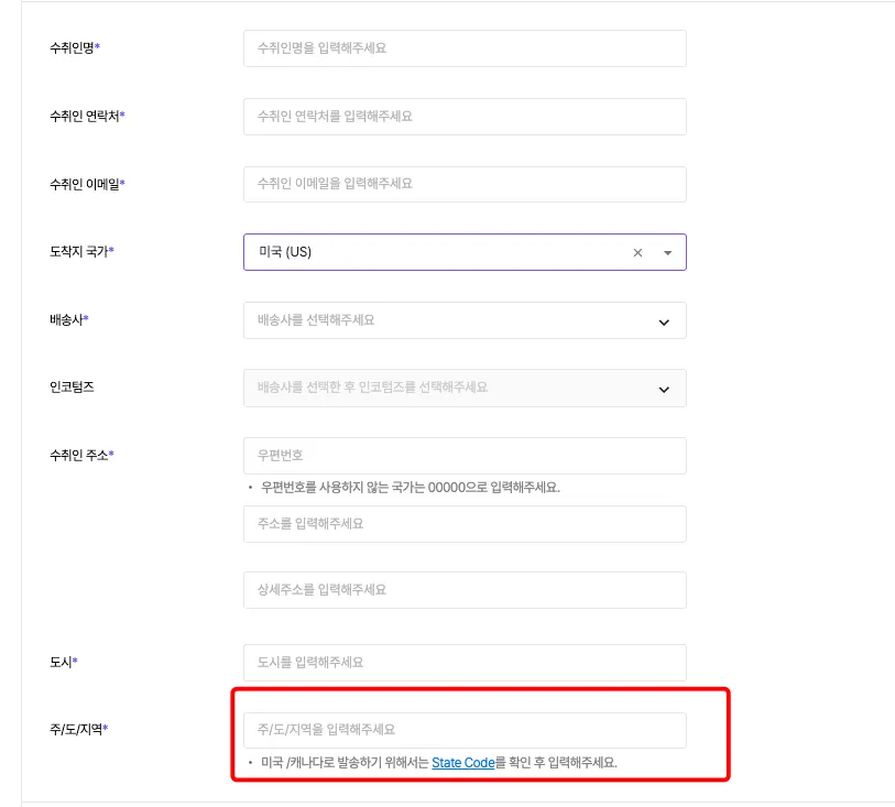 주문 개별 등록 /주문 일괄 등록 진행시 [해외 주문]에서 US/CA 도착지 국가를 선택할 때에 유의 사항 참고부탁드립니다.