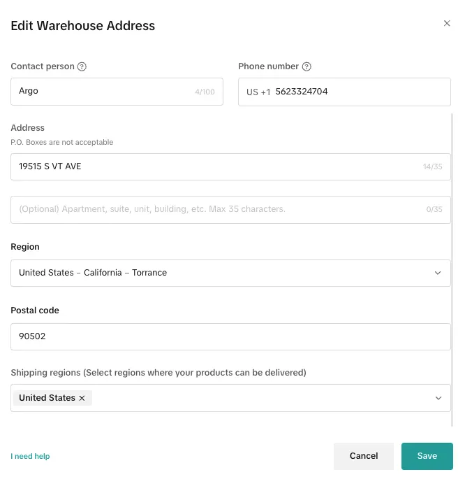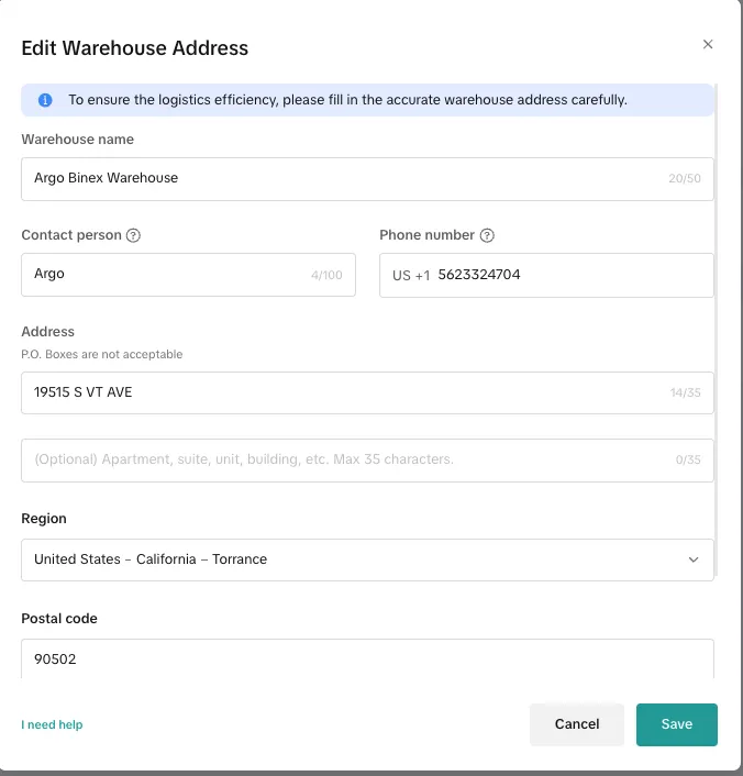 Pickup Warehouse가 존재할 경우 Edit 버튼을, 없을 경우 Add warehouse를 클릭 후, 아르고 바이넥스 미국센터의 주소로 변경해주세요.