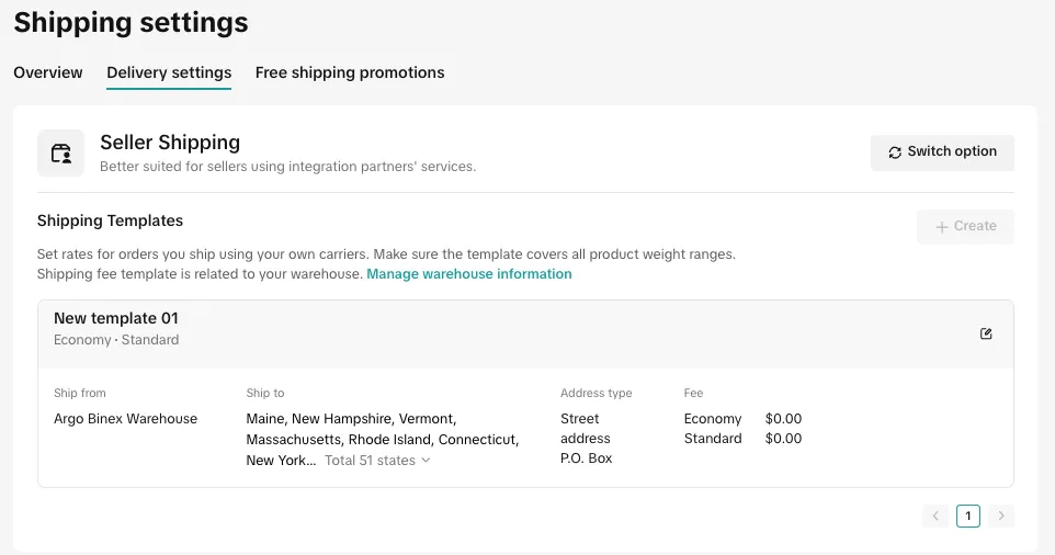 Shipping Settings에서 Switch Option을 클릭한 후, TikTok Shipping → Seller Shipping으로 변경해주세요.