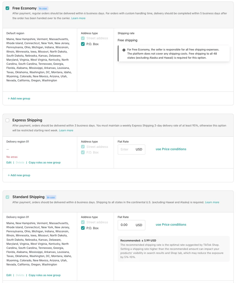 하와이, 알래스카로도 배송을 희망할 경우 각 Shipping 그룹에서 Add new Group을 클릭, 하와이 알래스카를 추가해주세요.