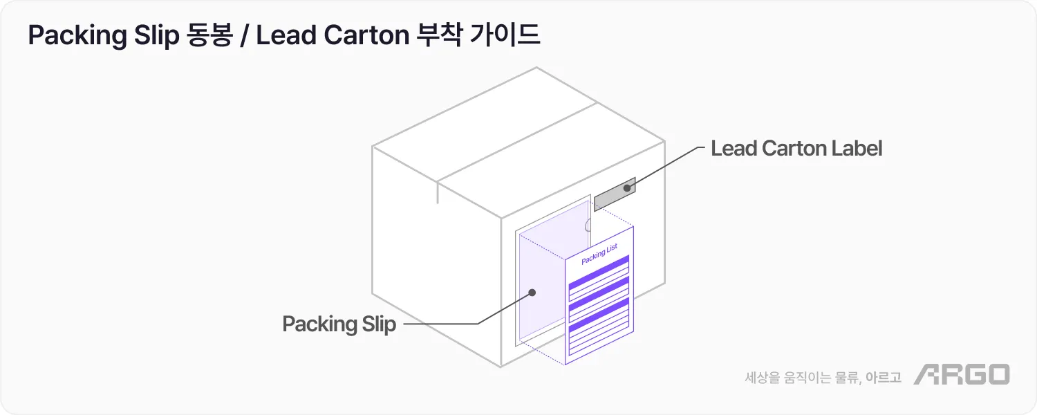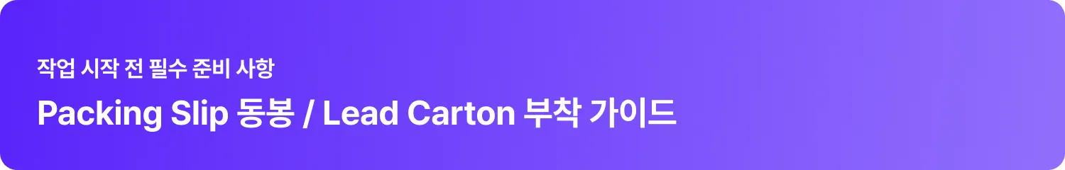 아래 가이드라인을 확인 후 Packing Slip(패킹리스트)를 투명 슬리브에 넣고, LEAD CARTON 외부에 부착해주세요.